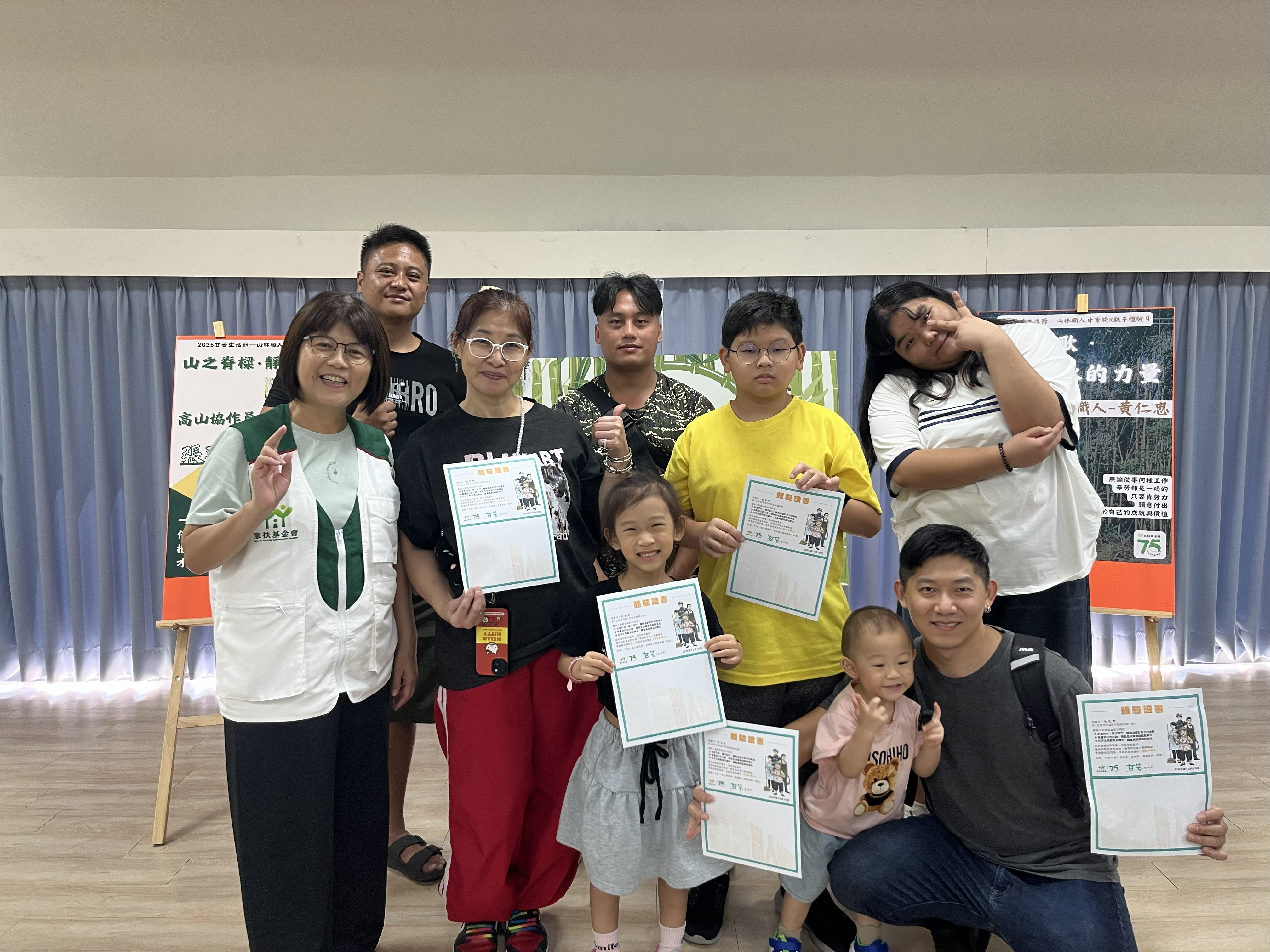 現場規劃「親子伐竹任務站」與「山路運補挑戰區」兩大體驗關卡,由家扶原鄉家長與青年親自帶領,讓親子家庭在汗水與笑聲中體驗職人的日常勞動。完成任務後,參與家庭獲頒「甘苦職人體驗證書」,象徵勇氣與體驗的印記,成為名副其實的「甘苦小達人」。