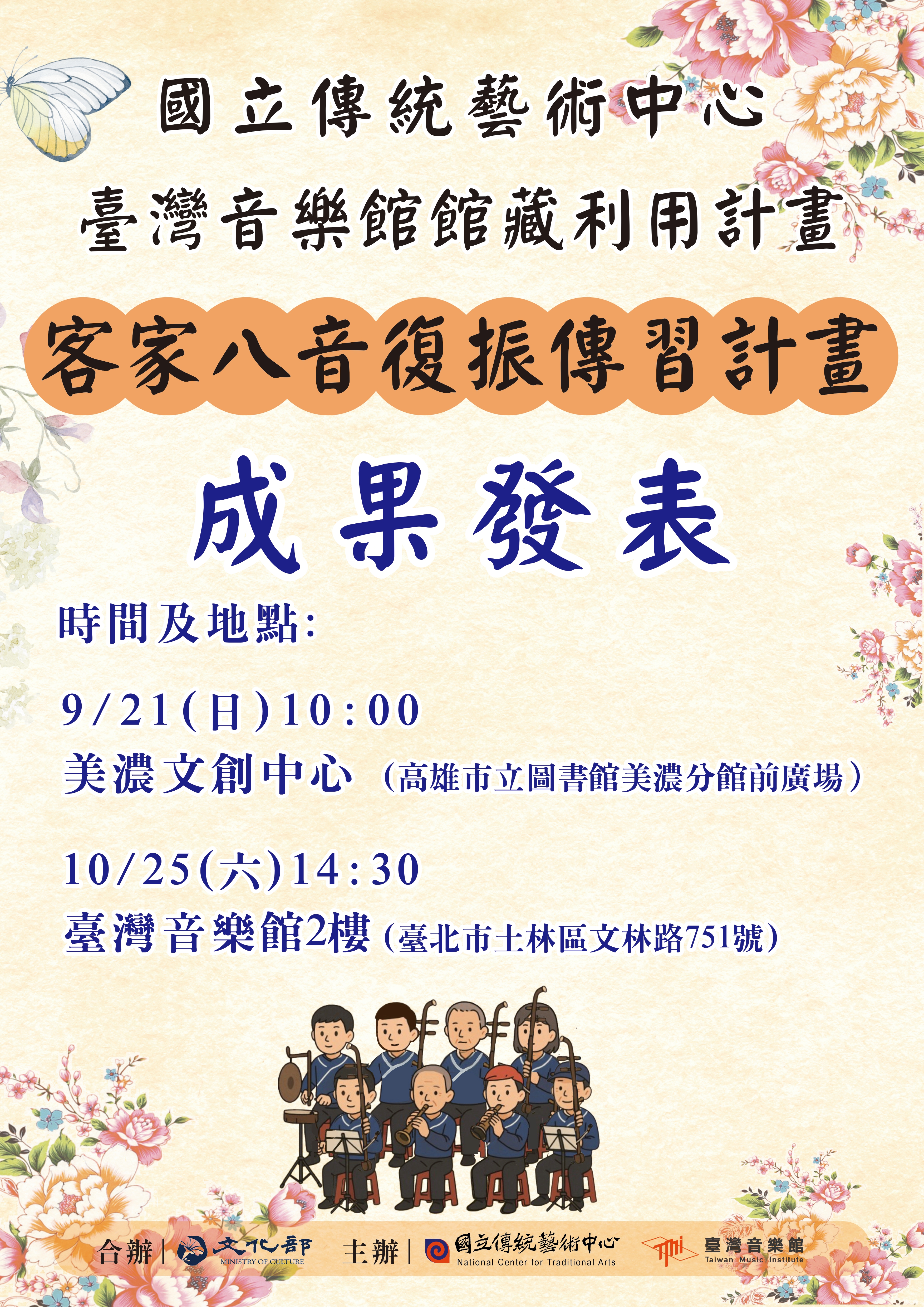 歷經上半年的整理研究與傳習課程後,本計畫復振成果將於十月底起陸續於臺北登場。首場由美濃客家八音團率先開演,於10月25日在臺灣音樂館2樓登場。作為文化部公告的「客家八音傳統表演藝術保存者」,美濃客家八音團以深厚文化底蘊重現昔日陪伴婚喪喜慶、祭典儀式的樂聲。本次由謝宜文團長率領樂師及參與計畫的青年共同演奏,展現自祖輩傳承至今的樂曲,象徵這項重要傳統藝術的延續與再生。