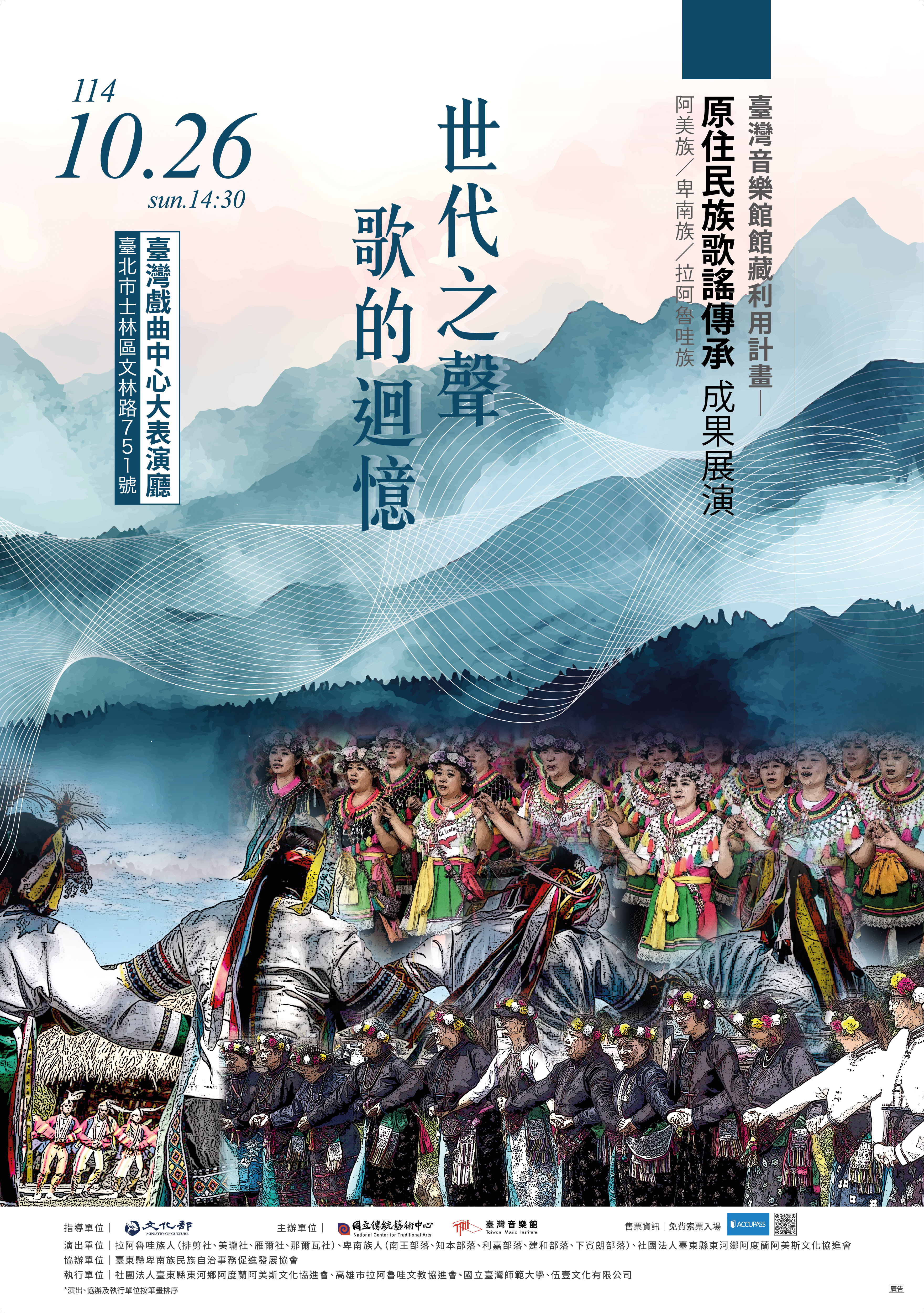 緊接著於10月26日在臺灣戲曲中心大表演廳舉行的《世代之聲.歌的迴憶》原住民族歌謠傳承音樂會,將集結卑南族、拉阿魯哇族與阿美族三族的成果。卑南族南王、知本、利嘉、建和、下賓朗等五個部落,運用臺灣音樂館館藏中呂炳川、史惟亮、陀沅錄、賴靈恩等珍貴錄音資料作為教材,讓歷史聲音再現舞臺;拉阿魯哇族則以祭儀歌謠為核心,透過影像與數位化保存,使齊唱、輪唱、複唱等獨特演唱方式得以延續;阿美族由都蘭部落林照明頭目帶領族人,以「一起呼吸、一起歌唱」為理念,展現傳統歌謠作為文化實踐與族群連結的力量。三族以不同風貌共同唱出文化記憶,展現族人對音樂傳承的熱情與決心。