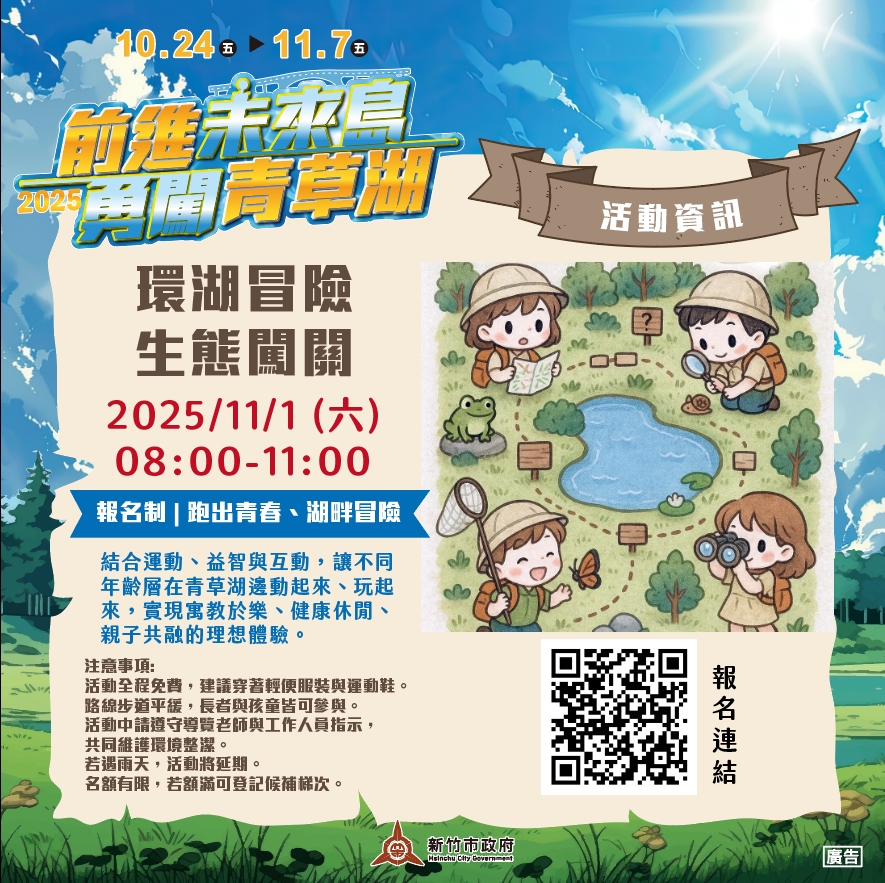 城銷處表示,活動期間內容豐富多元,「動漫變裝祭」將於10月26日14時登場,歡迎民眾化身最喜愛的角色報名參加(報名連結:https://reurl.cc/Qa0Gdp);而「湖畔冒險行」環湖闖關活動則於11月1日8時至11時舉辦(報名連結:https://reurl.cc/ekq7xW),邀請市民朋友一同體驗刺激又歡樂的冒險旅程。
