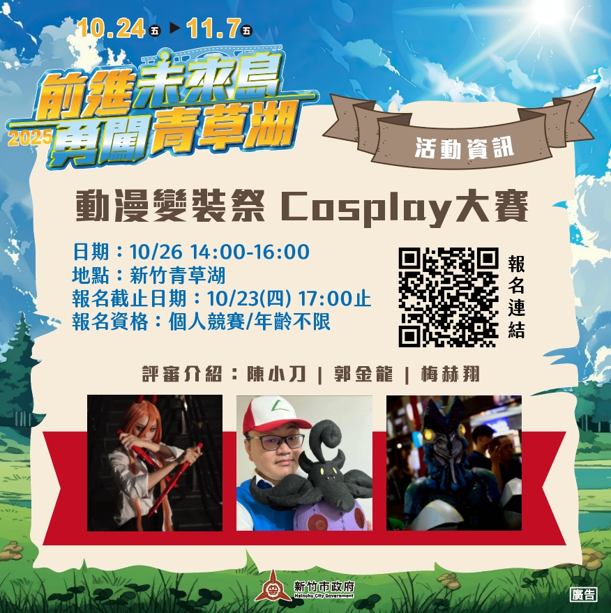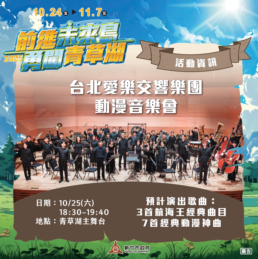 「2025前進未來島 勇闖青草湖」活動將於10月24日至11月7日在新竹市青草湖熱鬧登場,為期兩週的活動內容豐富多元,將掀起一股動漫熱潮。城銷處表示,現場不僅設置10大人氣動漫角色打卡裝置,更有高達12公尺的超巨大「千陽號」首度現身湖中,為青草湖注入滿滿熱血能量與冒險氛圍,預期將吸引大量動漫迷與遊客造訪,帶動竹市觀光新熱潮及周邊商機。 代理市長邱臣遠表示,市府團隊持續開發新竹觀光潛力,積極推動「新竹山湖海」觀光策略。