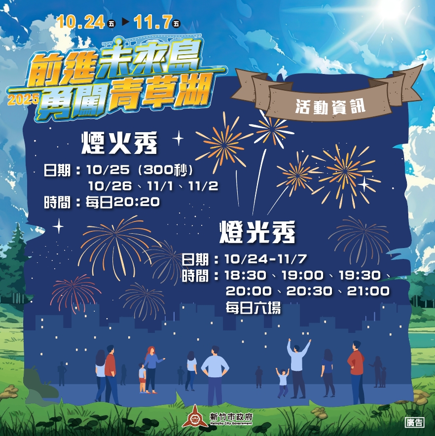 民眾只要至角色打卡裝置掃描QR Code完成集章任務,即可兌換限定徽章,收藏屬於自己的冒險回憶。 城銷處說明,為讓民眾夜間也能感受湖畔魅力,活動期間每晚18時30分至21時將每半小時上演一場精彩湖上燈光秀;而在10月25日、10月26日、11月1日及11月2日20時20分,更將施放繽紛煙火秀,點亮夜空、照耀青草湖。 城銷處補充,活動期間共5天週末假日(含光復節連假)14時起,主舞台將安排連續表演節目;傍晚18時於湖畔更推出假日限定主題酒吧,提供角色特調飲品,打造沉浸式的動漫體驗。歡迎全國民眾相約前來新竹,展開一場充滿熱血與夢想的秋日冒險。