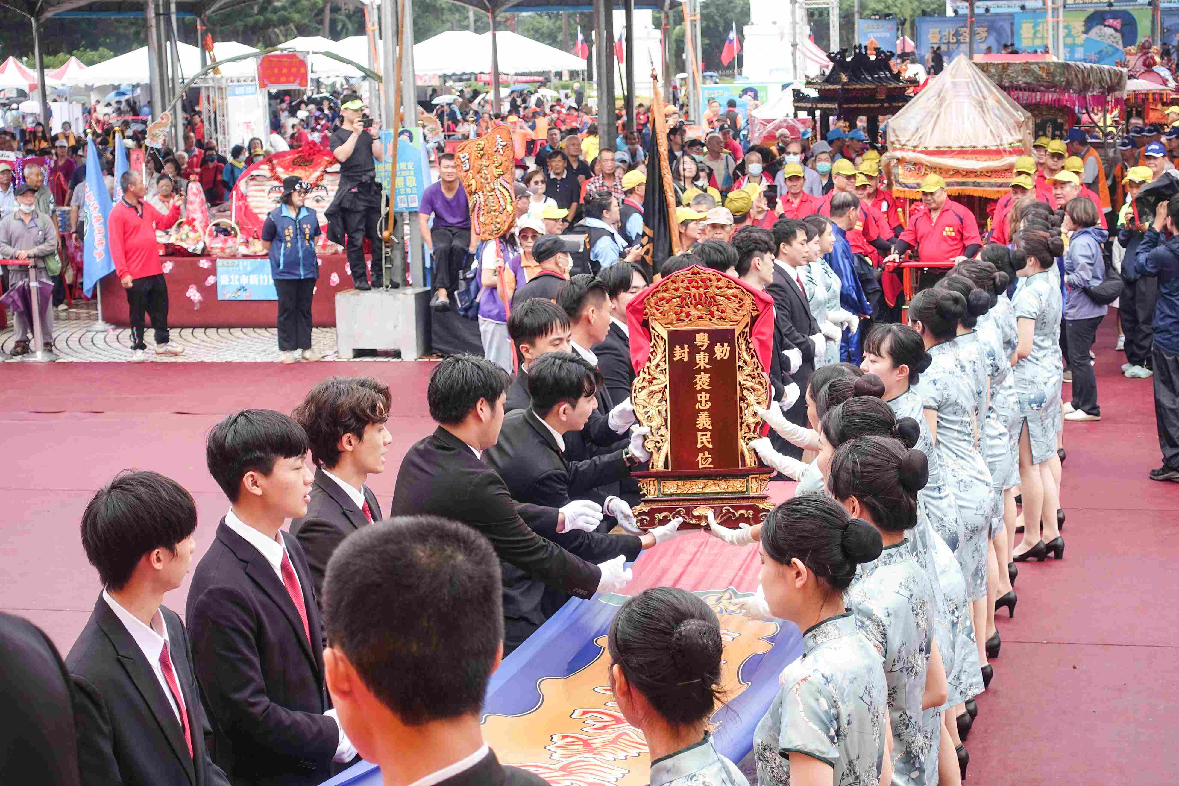 接過一座座義民牌位,客家委員會副主任委員邱星崴10月25日前往中正紀念堂兩廳院藝文廣場出席「2025台北客家義民嘉年華-安座大典」,向義民爺上香祈福,祈求風調雨順、國泰民安。