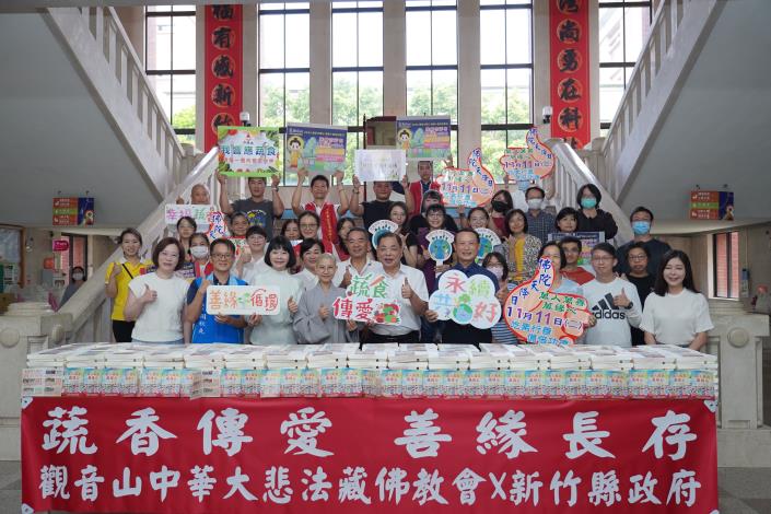 為推廣蔬食、響應環保減碳、愛護地球的理念,觀音山 中華大悲法藏佛教會在吉祥的「佛陀天降月」(10/22~11/20)推廣「蔬食環保救地球」等五大善行。觀音山新竹金剛手道場鄭德美會長10月30日代表佛教會到新竹縣政府,免費致贈700份蔬食便當,盼藉由清淨蔬食,傳遞善念與關懷。副縣長陳見賢讚譽中華大悲法藏佛教會長期推廣蔬食文化、以實際行動倡導健康環保的生活方式,代表楊文科縣長頒發「蔬香傳愛 善長存」感謝狀,會場流動愛與善念,十分溫馨。