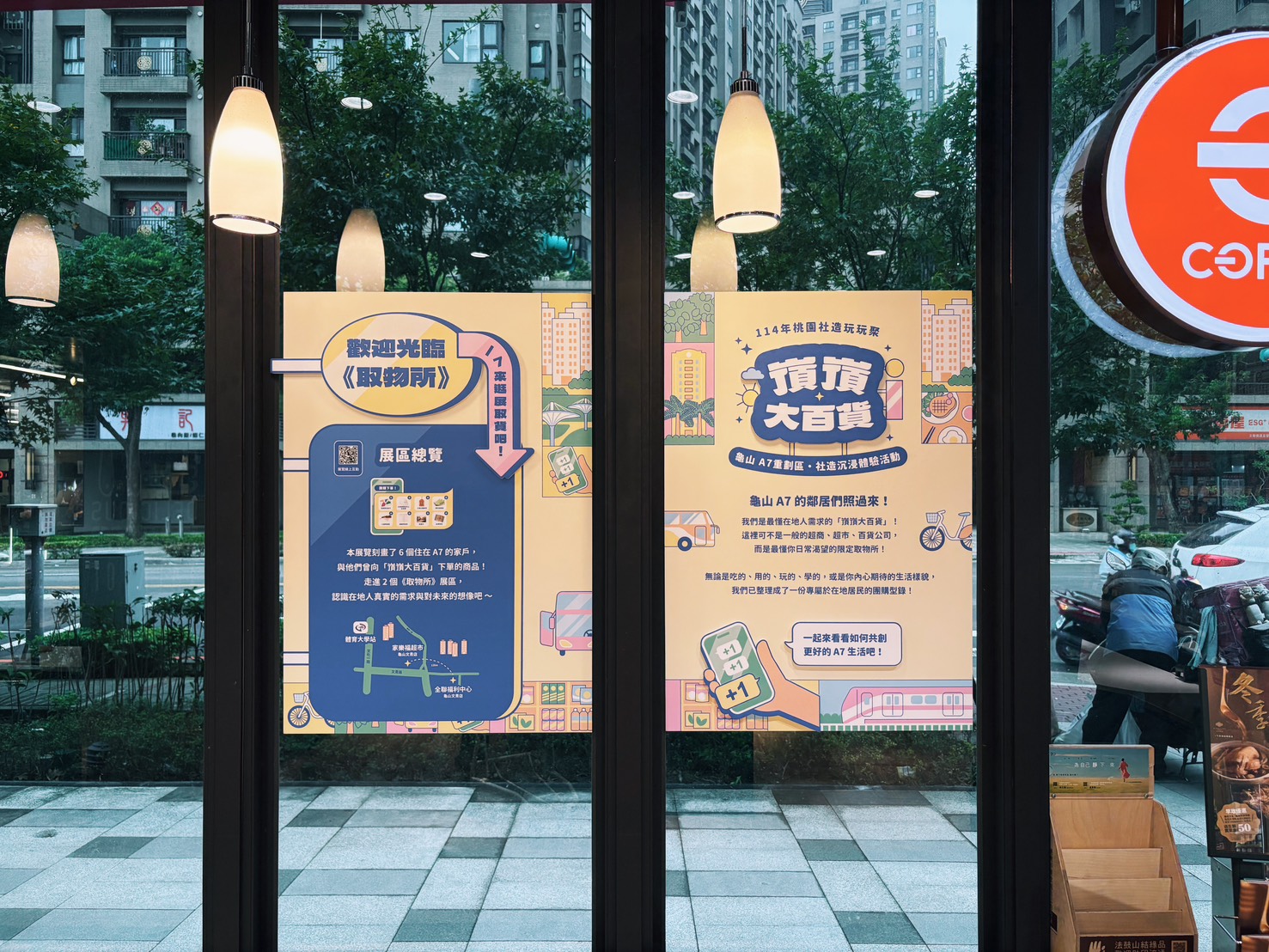 為貼近民眾生活所需,活動特別規劃《取物所》展覽,並首度與「家樂福龜山文青店」及「全聯龜山文青店」合作。民眾在日常購物的場景中,即可透過觀賞展覽與互動,了解社區居民的生活經驗與需求,同時也回望自己的生活現場,帶走一份對未來日常的新想像。前100名完成「展覽小任務」者,即贈《桃園社造玩玩聚》摺疊環保杯1個。