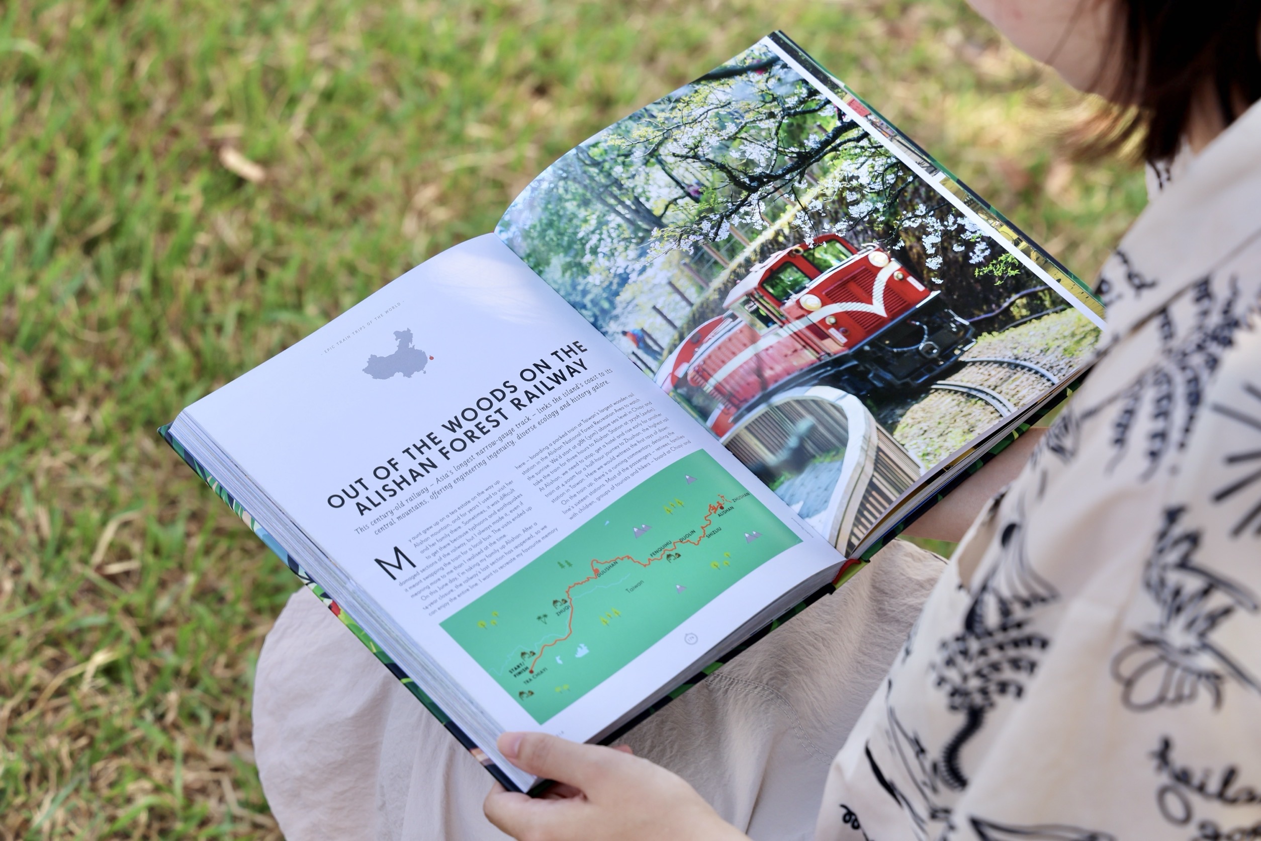 書中以「穿越森林的阿里山鐵道之旅」(Out of the Woods on the Alishan Forest Railway)為題,以篇幅完整四頁專文介紹這條百年森林鐵道的歷史與魅力。作者以第一人稱之旅行敘事角度,描繪從嘉義出發之小火車如何一路攀升至阿里山國家森林遊樂區,穿越竹崎、奮起湖、十字路與祝山,展開一段結合自然、人文與情感的旅程。
