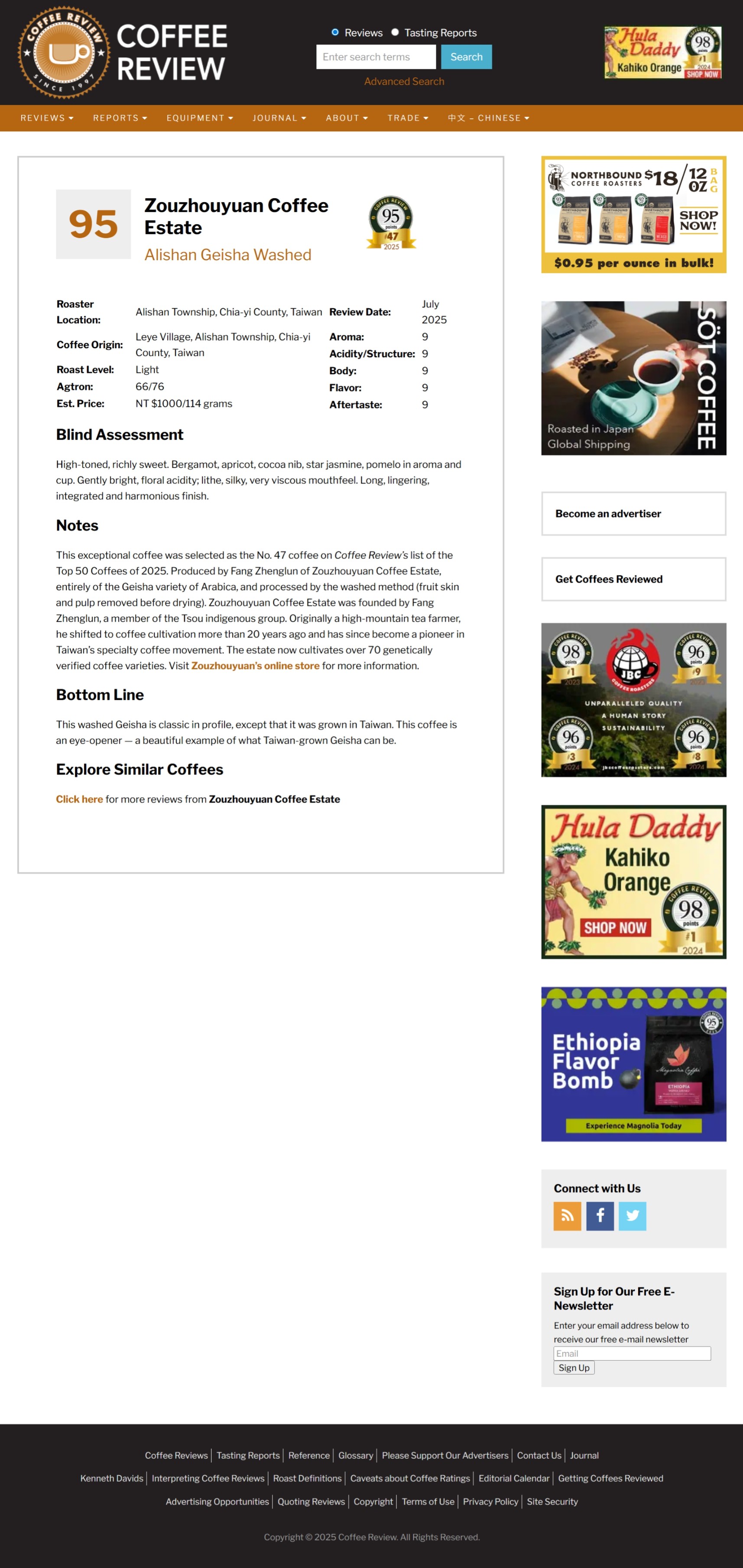 三家參展業者皆為阿里山地區具代表性的精品咖啡莊園,其中「鄒築園精品咖啡莊園」Zouzhouyuan Coffee Estate以其Alishan Geisha Washed在今年獲得Coffee Review高度評價,成功入選「2025 Top 50 Coffees」第 47 名,評審一致肯定其香氣與口感表現,乾淨細緻的風味層次及高山產區特色使其從眾多競品中脫穎而出,在國際市場上備受矚目。「聯合成青葉咖啡莊園」,採無毒農業栽種,期望透過一杯咖啡,讓世界認識台灣咖啡的純淨與魅力。「仙井咖啡莊園」,由年輕一代返鄉經營,融合創新烘焙技術與產地故事,展現阿里山新生代咖啡能量。
