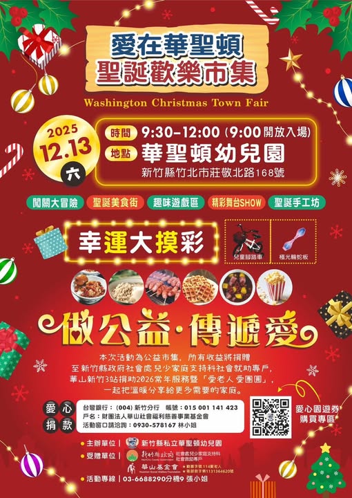 本次活動結合親子同樂與 市集義賣活動、親子遊戲、表演的方式,讓孩子在歡樂中學習分享與感恩,並將當日所得捐贈新 竹縣政府社會處/兒少家庭支持科與及協助華山基金會新竹3站募集2026常年服務暨 「愛老人 愛團圓」服務計畫,幫助弱勢家庭與長者,感受節日温暖,以實際行動傳遞愛心。