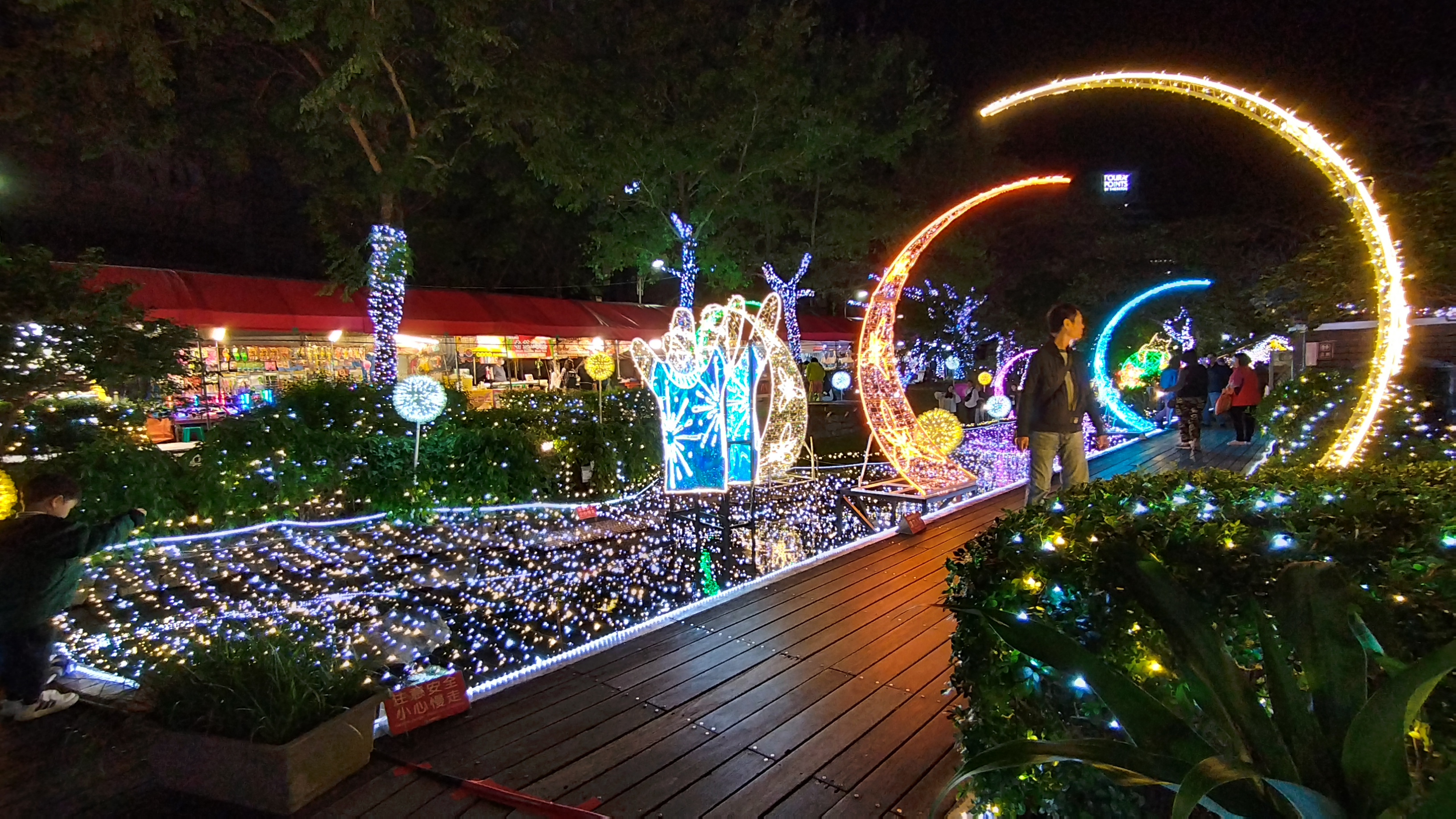 配合2025冬戀蘭陽溫泉季活動舉辦,主會場湯圍溝溫泉公園亦有光彩奪目的燈光裝置藝術布置,首先映入眼簾的是高達6公尺、寬9公尺的主燈,以「蘭陽風景」及「山形縣花笠舞」為主題,運用相框式前後景設計增添互動趣味,讓山海交融的宜蘭風光成為拍照的最佳背景。