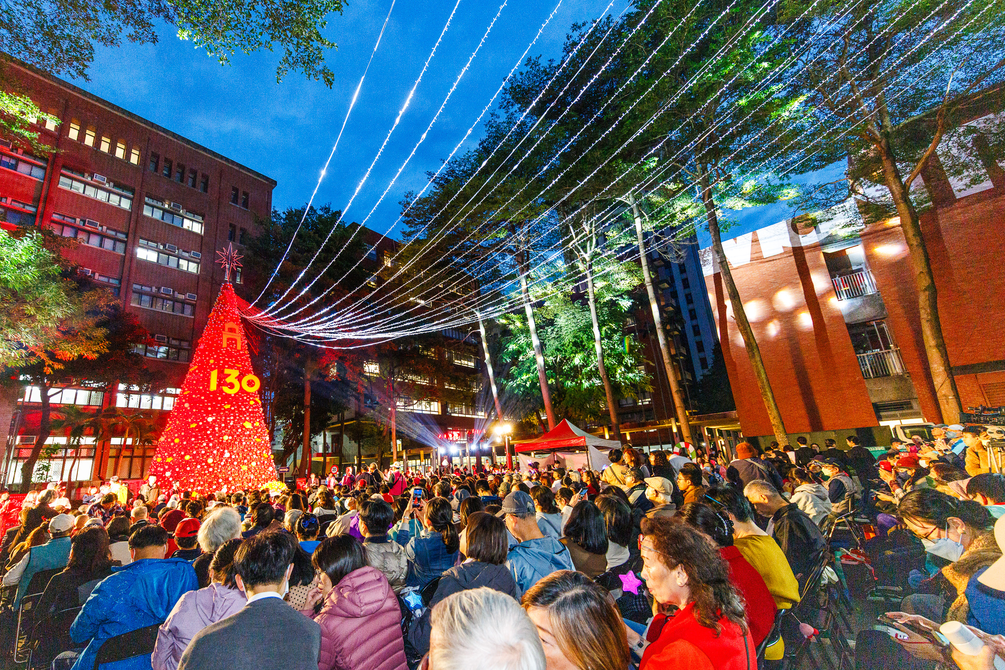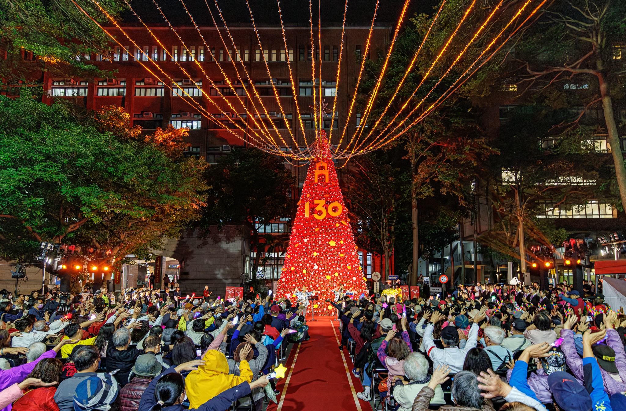 你看過全紅的聖誕樹嗎?國北教大今(27日)舉辦「130向前走」校慶點燈祈福典禮,是國北教大及校友總會、億光文化基金會主辦,結合「雙春金蛇年」意涵,用5000多顆金銀紅聖誕球妝點,在絢麗天幕光影折射的璀璨燈海下展開,吸引上千師生及各界貴賓同來祝賀,成為歲末最夯最飆的浪漫風情!