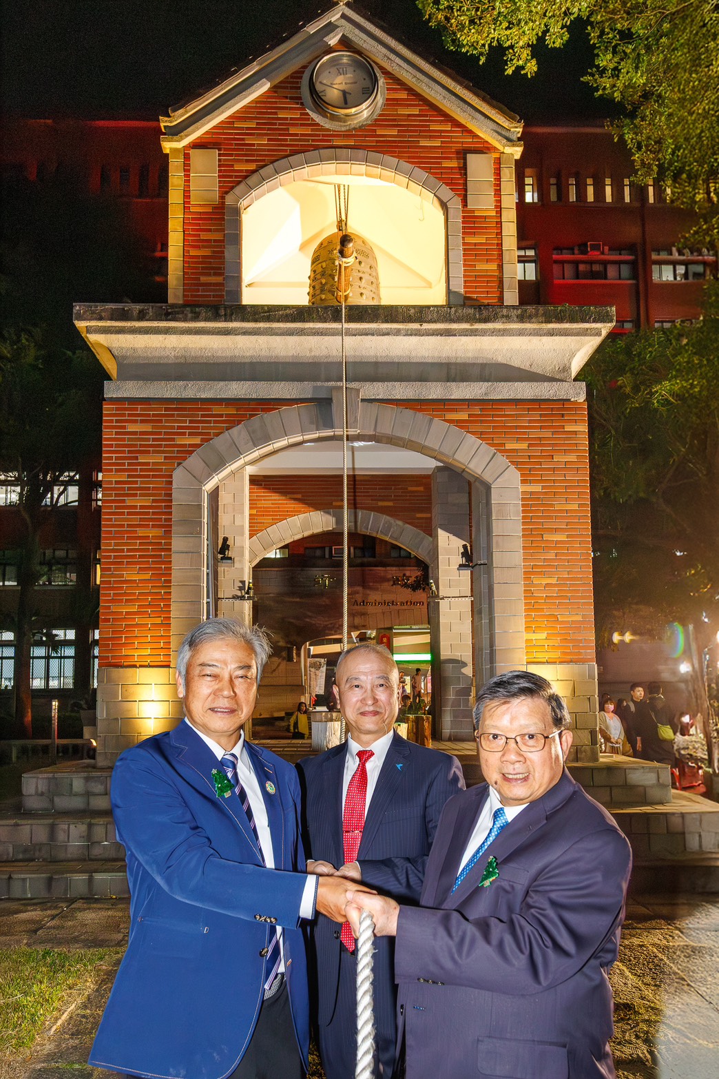 3_ 陳慶和校長、粘舜權理事長與葉寅夫董事長一同敲響象徵祝福與希望的和平鐘