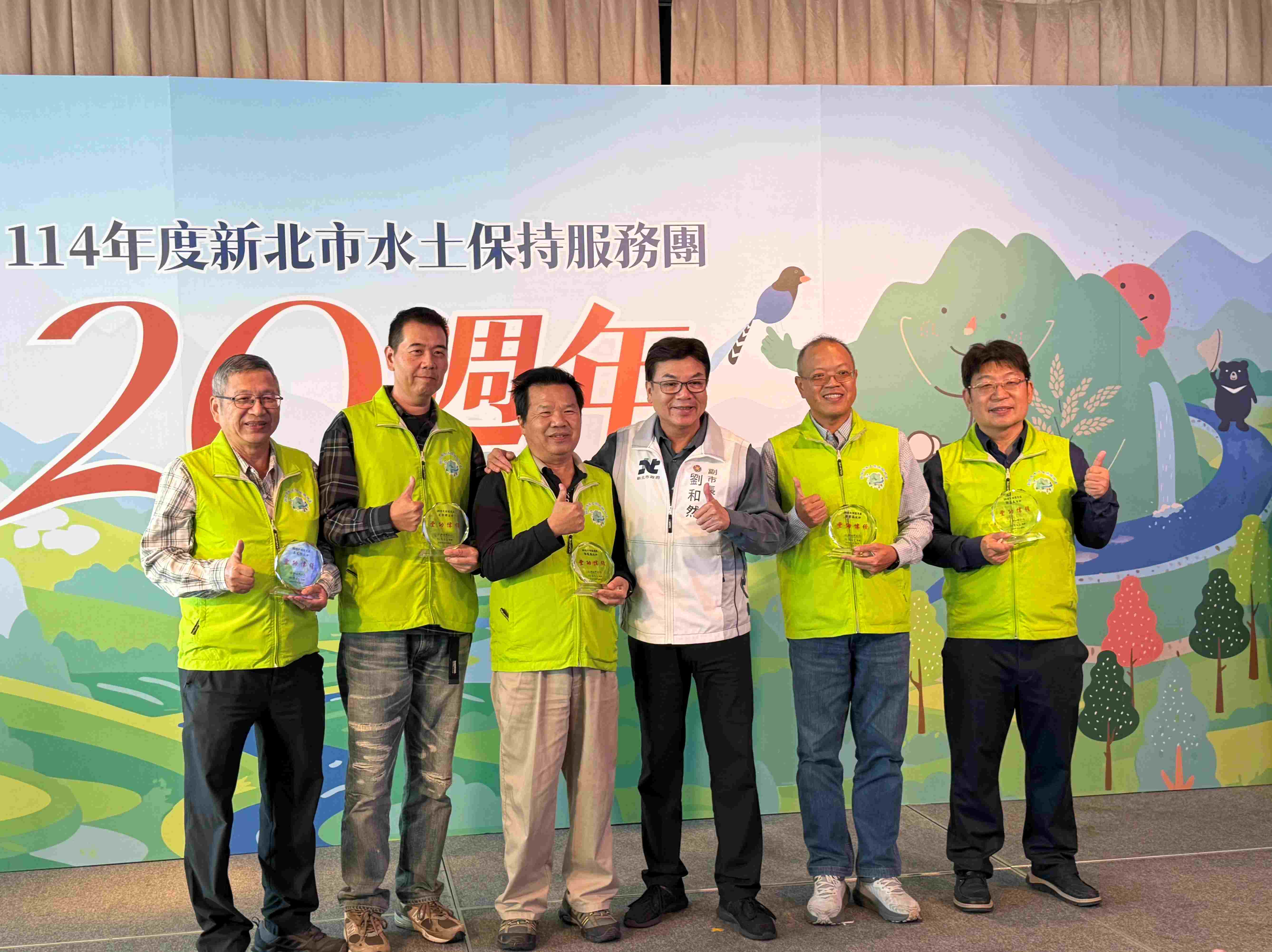 新北市政府於11月28日辦理「新北市水土保持服務團成立20週年」表揚暨組訓活動,副市長劉和然頒獎表揚5位在水土保持服務團服務滿20年的績優貢獻團員,感謝這群無私奉獻並致力將水土保持觀念導入新北市每個角落的英雄。新北水保服務團20年來協助市府水土保持服務案件達上萬件,專業服務已連續5年獲得農業部評核為全國績優水保服務團的肯定,由陳盈男團長代表將114年度全國績優服務團之獎座獻予市府,期望透過表揚團員暨組訓活動凝聚水保服務團守護新北市坡地安全的共識。