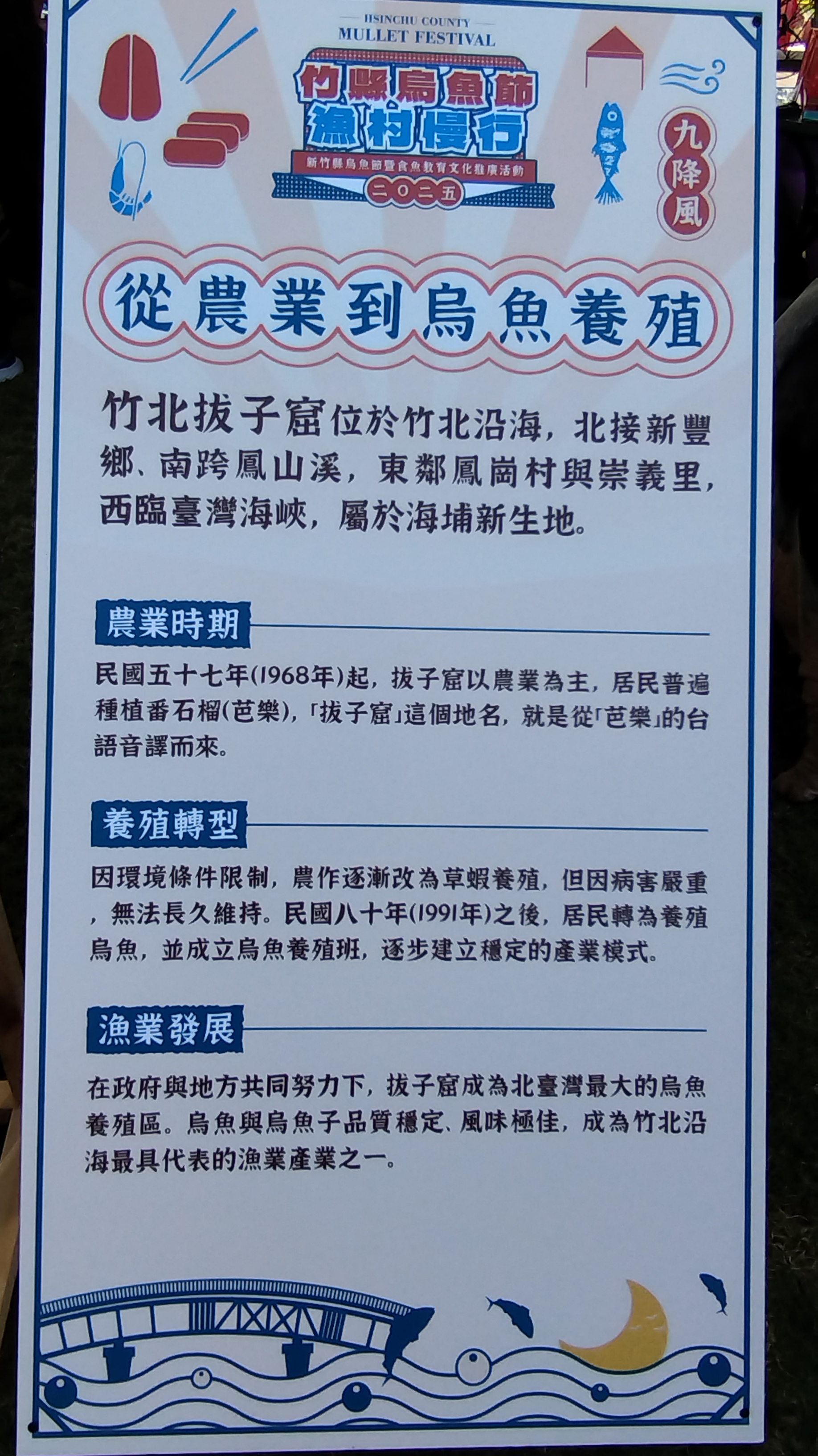 烏魚節是竹北養殖區最重要的收穫節令,今年希望透過「漁村慢行」主題,讓民眾實地了解當地產業文化與永續價值,並促進地方觀光,期望大眾共襄盛舉,一同品味烏魚季獨特迷人的風味。
