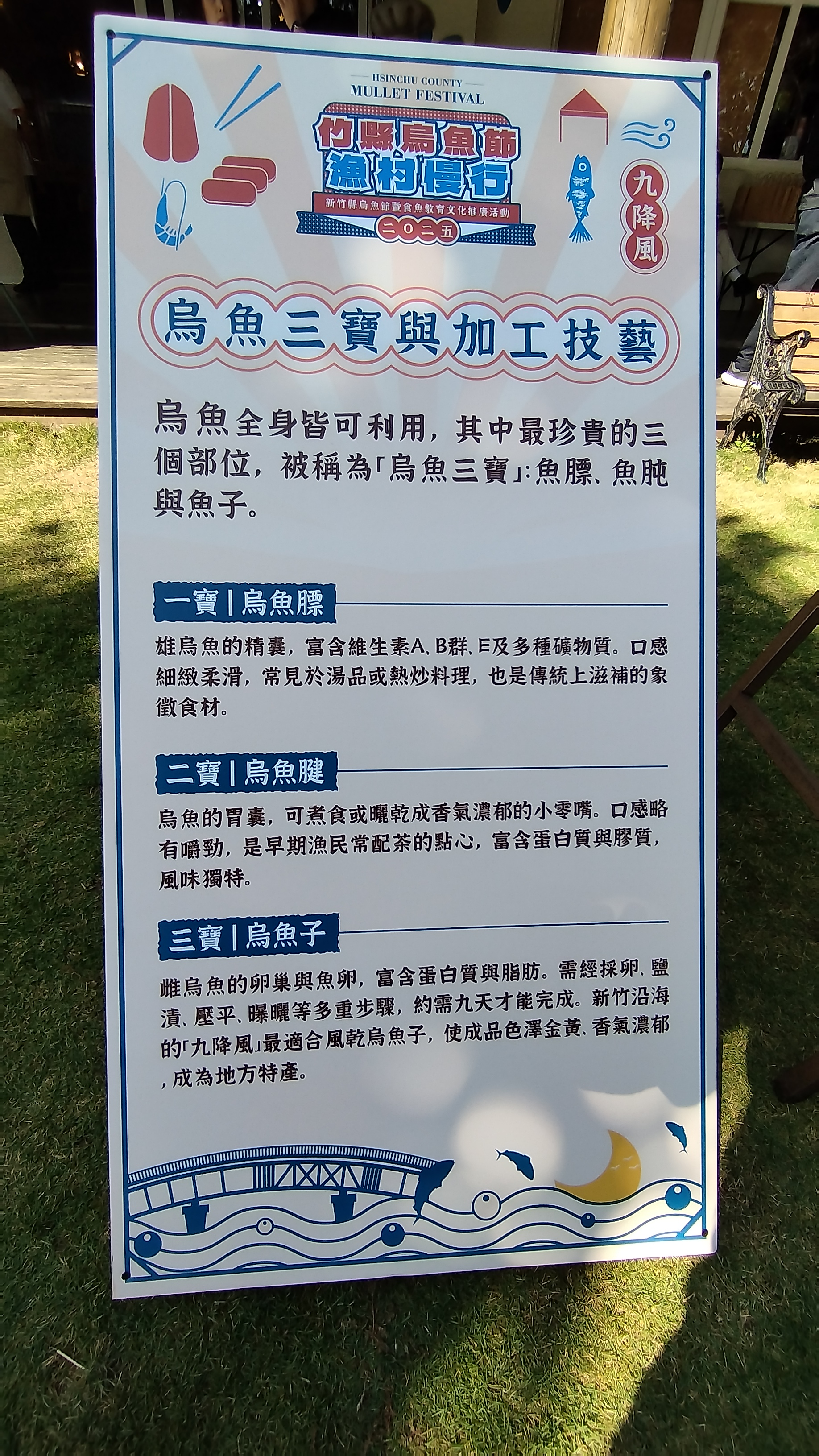 29日推出烏魚文化靜態展、在地特色市集、海廢變黃金DIY體驗,並限量提供250份漁夫餐盒,以竹北在地食材搭配烏魚相關產品入菜,呈現最道地的海口風味料理。現場同步贈送「烏金郎娃娃」,並推出「多買多送」市集集點抽獎活動,鼓勵民眾支持在地農漁產品。同時也在活動中融入海洋環保永續理念,透過全魚利用與環保手作的方式,讓民眾從中體會友善環境的態度。舞台更安排Emma姐姐氣球秀、奇幻泡泡秀、賽考獵客樂團及Blueburn主唱趙廣絜KJ輪番演出,打造最具漁村特色的節慶氛圍。