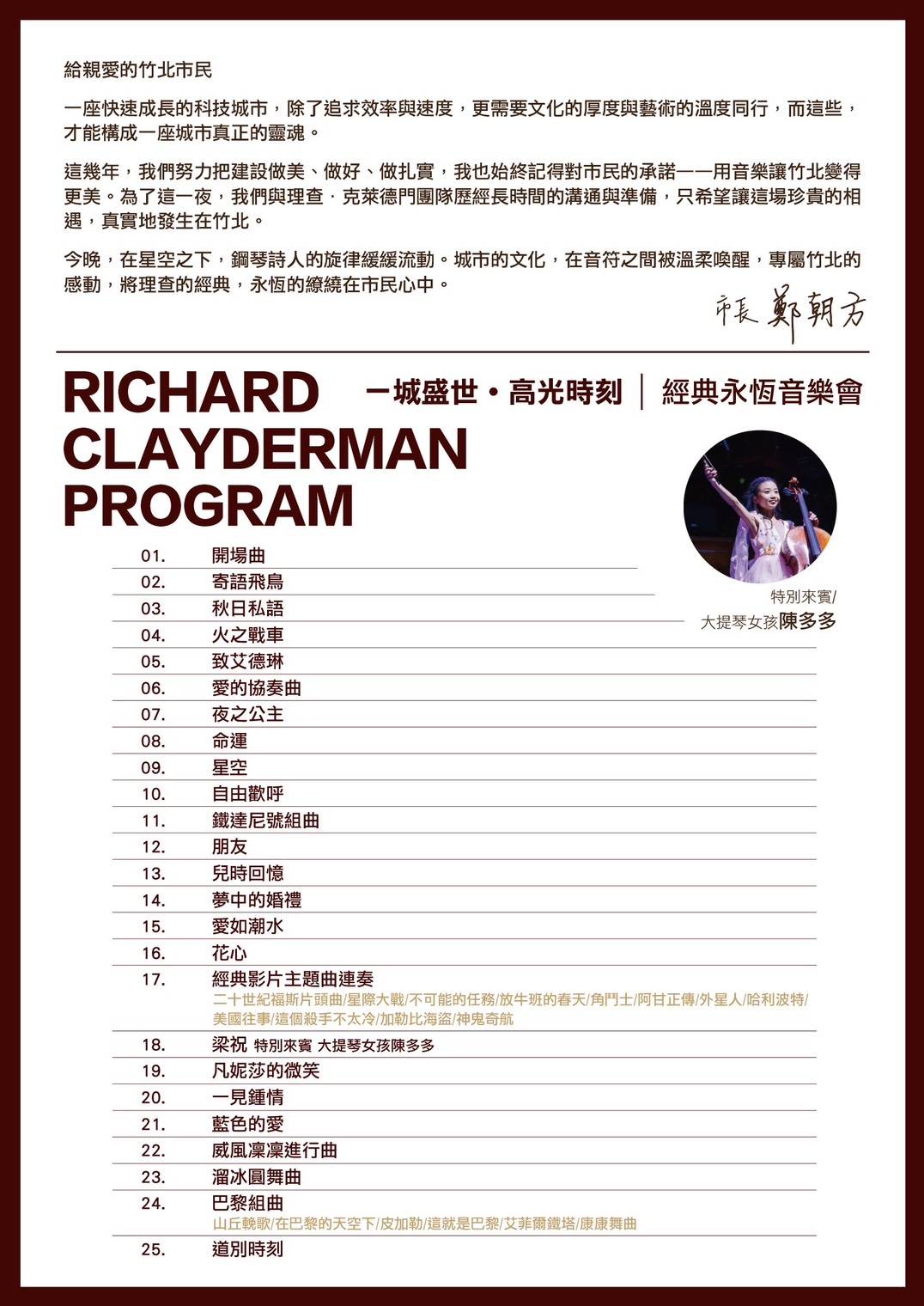 此外,鄭朝方也透露理查將為竹北帶來90分鐘的演奏,包含寄語飛鳥、秋日私語、火之戰車、致愛德琳、愛的協奏曲、夜之公主、凡妮莎的微笑等多首經典曲目,獻給喜愛音樂的市民朋友。