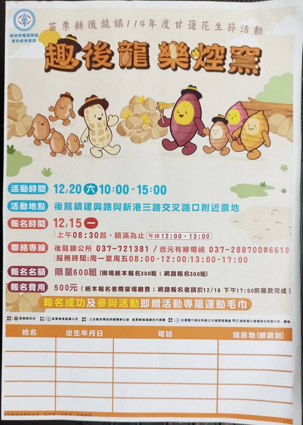 苗栗縣後龍鎮114年度甘藷花生節活動記者會,114年12月11日(四)上午9時30分於後龍鎮公所大廳舉行,活動日期則為114年12月20日(六),於後龍鎮建興街與新港三路附近農地舉行。