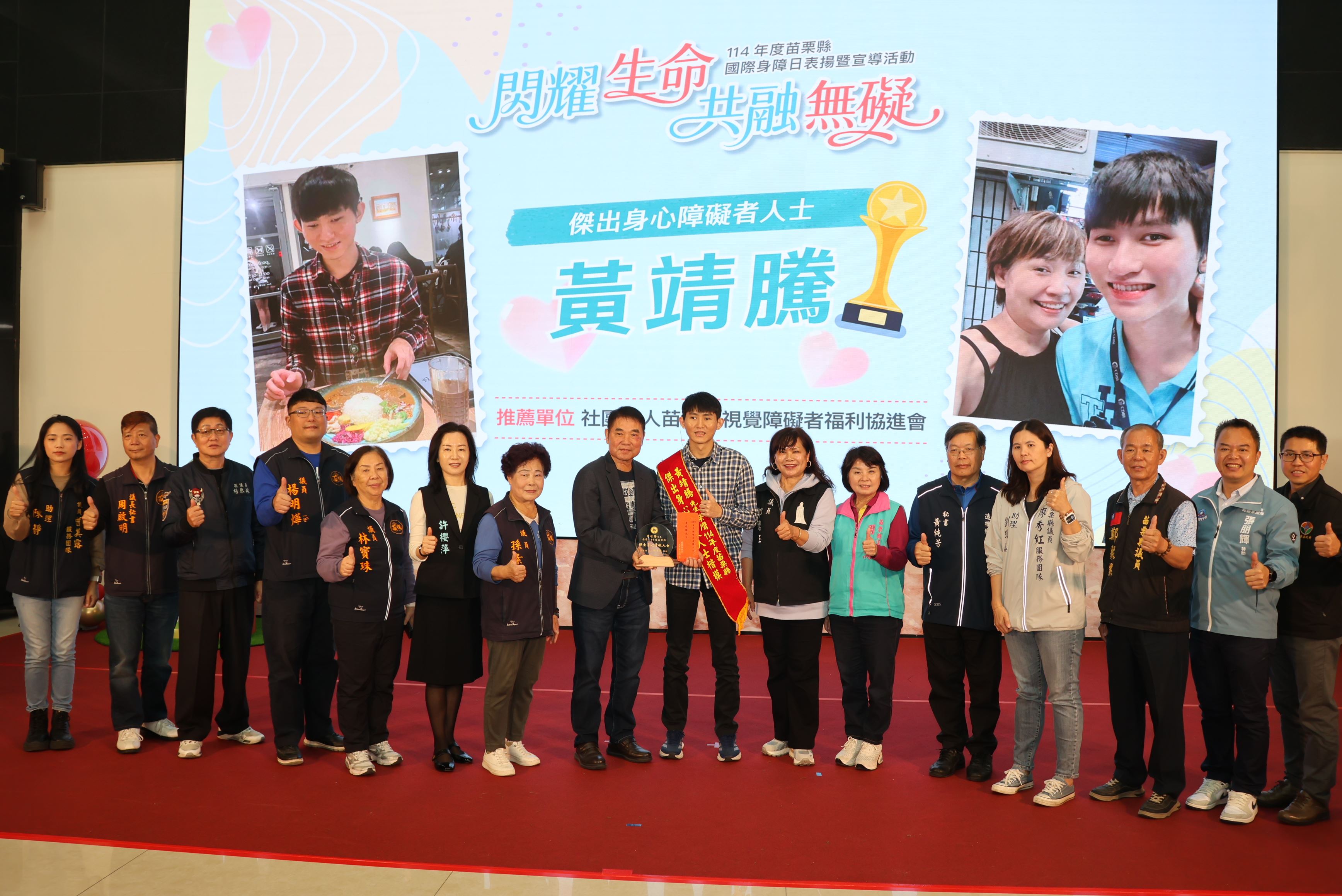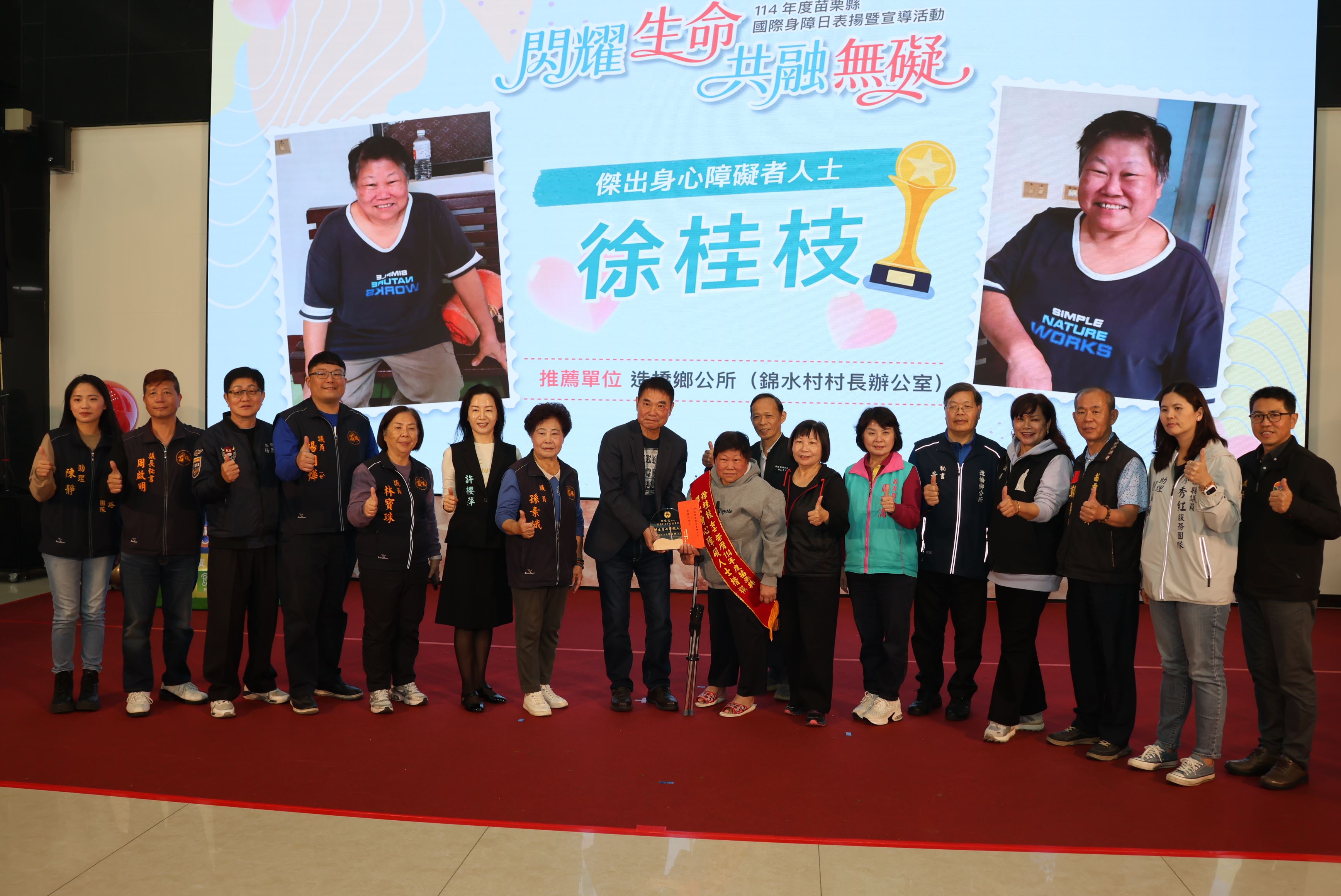 16日頒獎典禮邀請2025總統教育獎獲獎人賴欣儀分享從如何克服身體限制走向國際舞台的生命經驗分享,給台下觀眾莫大鼓勵及啟發,隨後由苗栗縣長鍾東錦頒獎表揚6個獎項、46組受表揚者及單位,議員孫素娥、許櫻萍、周玉滿、禹耀東、楊明燁、林寶珠、鄭碧玉、楊恭林、鄭聚然、立委邱鎮軍助理、議長李文斌秘書、議員曾美露助理、邱毓興助理、張佳玲助理、葉忠倫助理、廖秀紅助理、大湖鄉長黃惠琴、銅鑼鄉公所課長、造橋鄉公所秘書等人也到場祝賀。