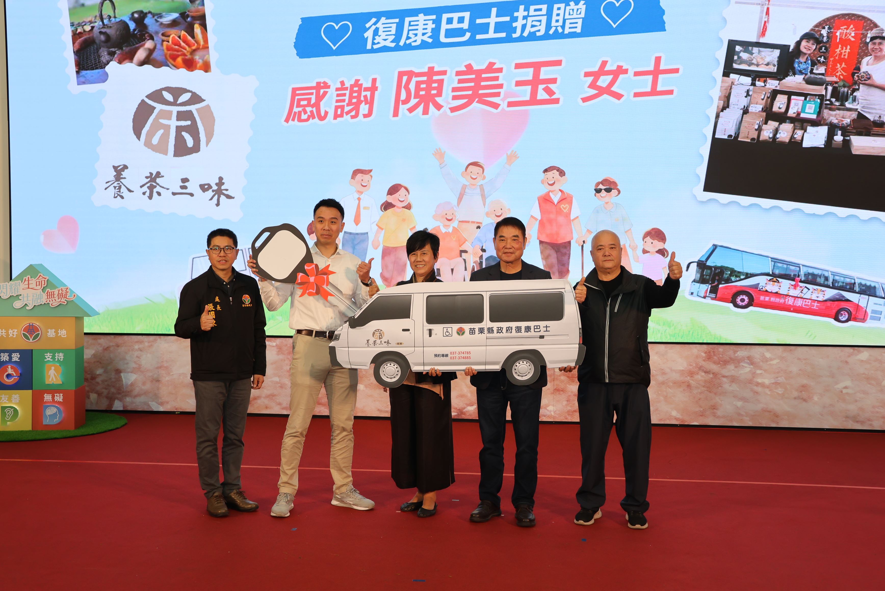 會中,除頒獎典禮外,養茶三味理事長陳美玉偕同兒子徐丞璽捐贈價值115萬元的復康巴士,讓身障者在苗栗能享有輕鬆就醫、社會參與等便捷的服務與權利。縣長強調,縣府管理復康巴士汰舊換新,今日受贈後全縣將有46部復康巴士提供接送服務,期許未來各界能給予苗栗縣更多資源,縣府團隊定會持續努力打造讓身障朋友活動更順利友善的環境,同時也要感謝今日獲獎者們的付出,讓苗栗縣幸福感大幅提升。