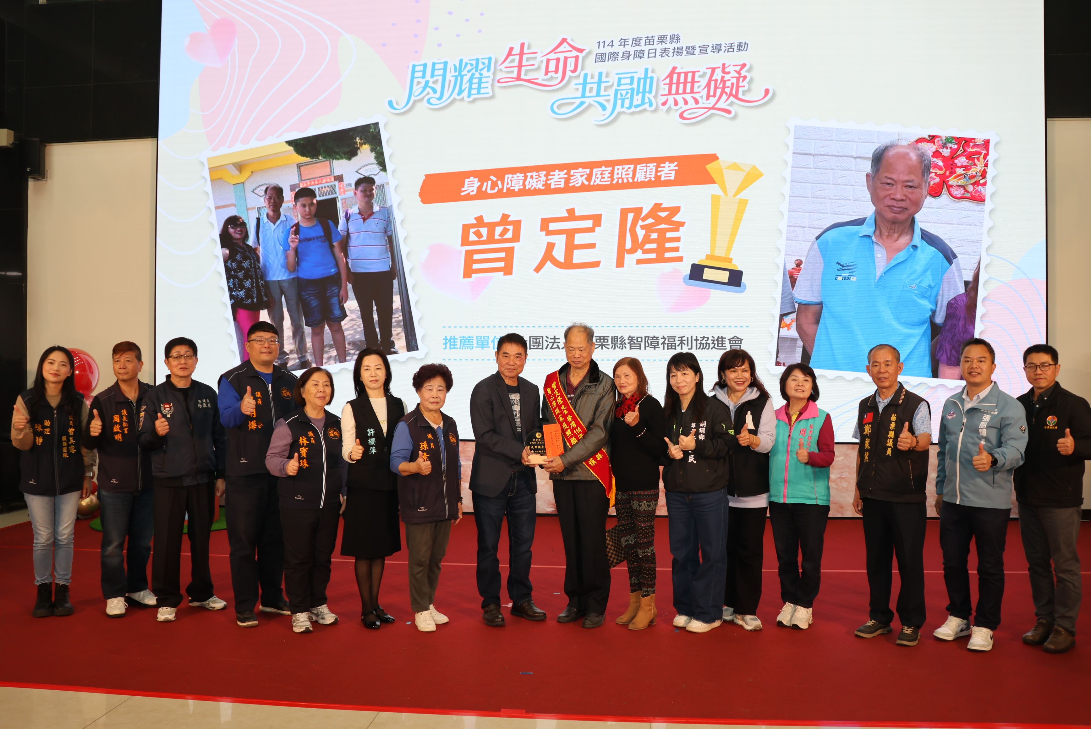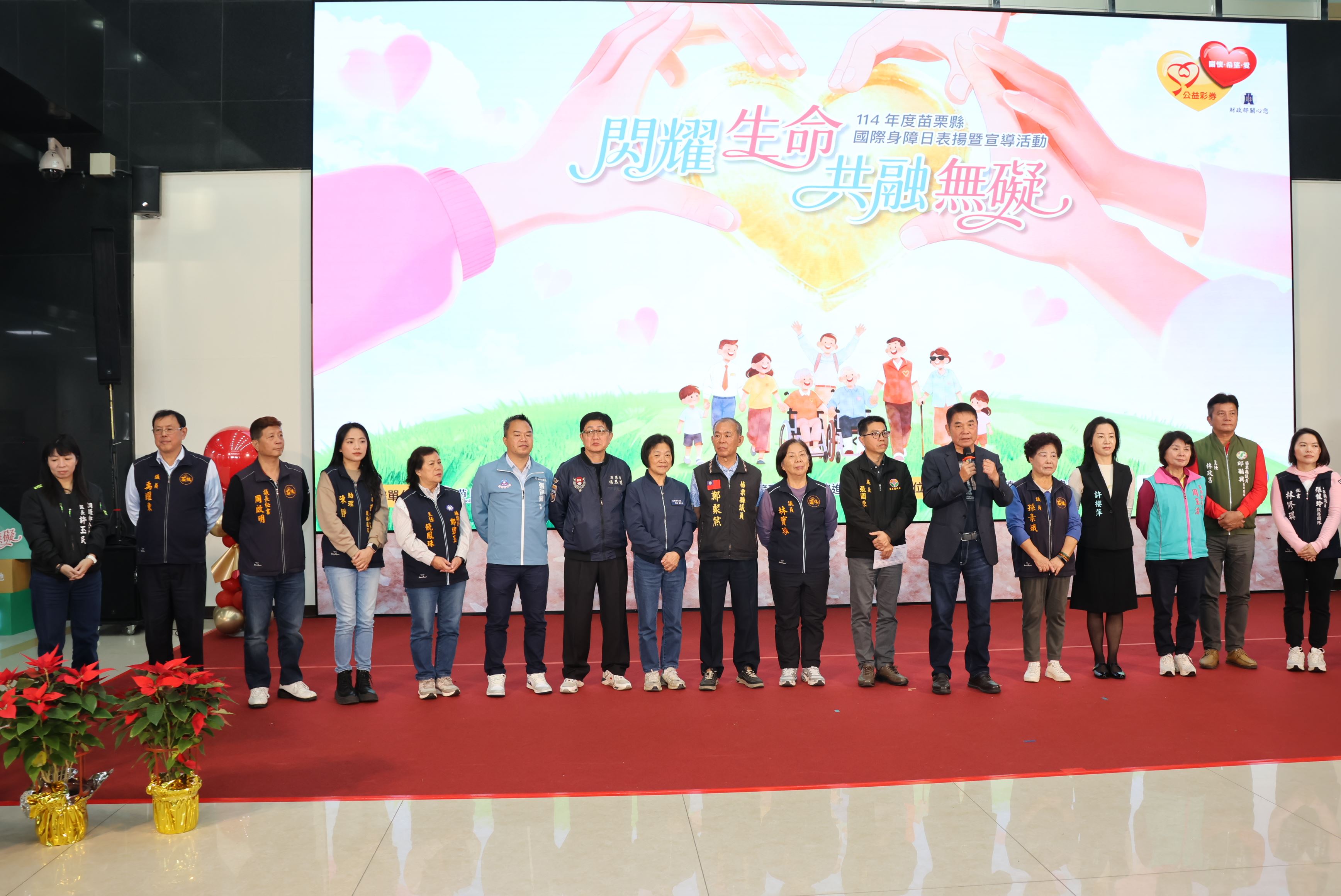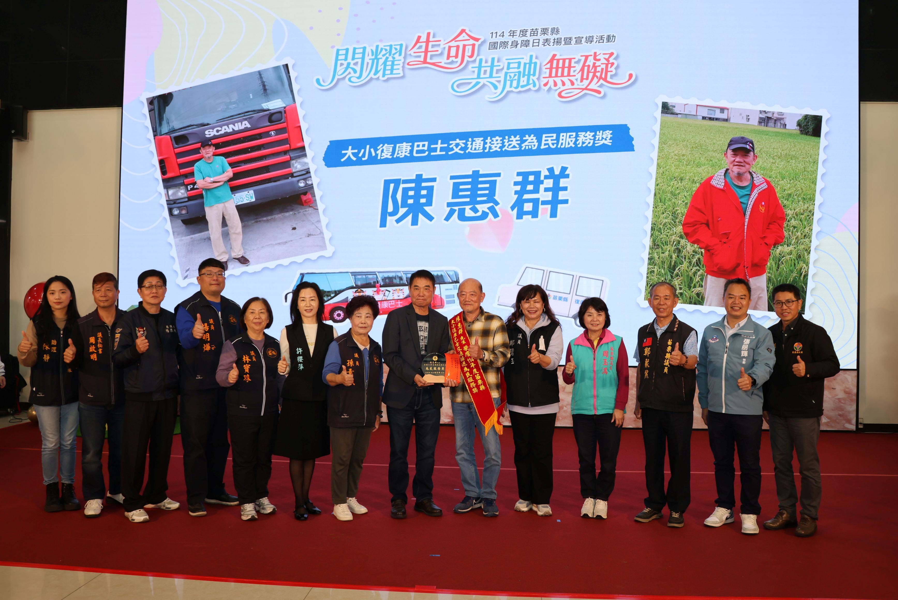 苗栗縣政府12月16日舉辦114年度苗栗縣「閃耀生命.共融無礙」國際身障日表揚暨宣導活動,苗栗縣長鍾東錦頒獎表揚績優楷模,會中苗栗縣客家酸柑茶文化推廣協會理事長、頭屋鄉養茶三味陳美玉偕同兒子、常務監事徐丞璽捐贈115萬元的復康巴士,縣長感謝各界對營造友善環境的努力,未來縣府持續提升本縣身障朋友的權益與福利,打造苗栗為平等共融的城市。