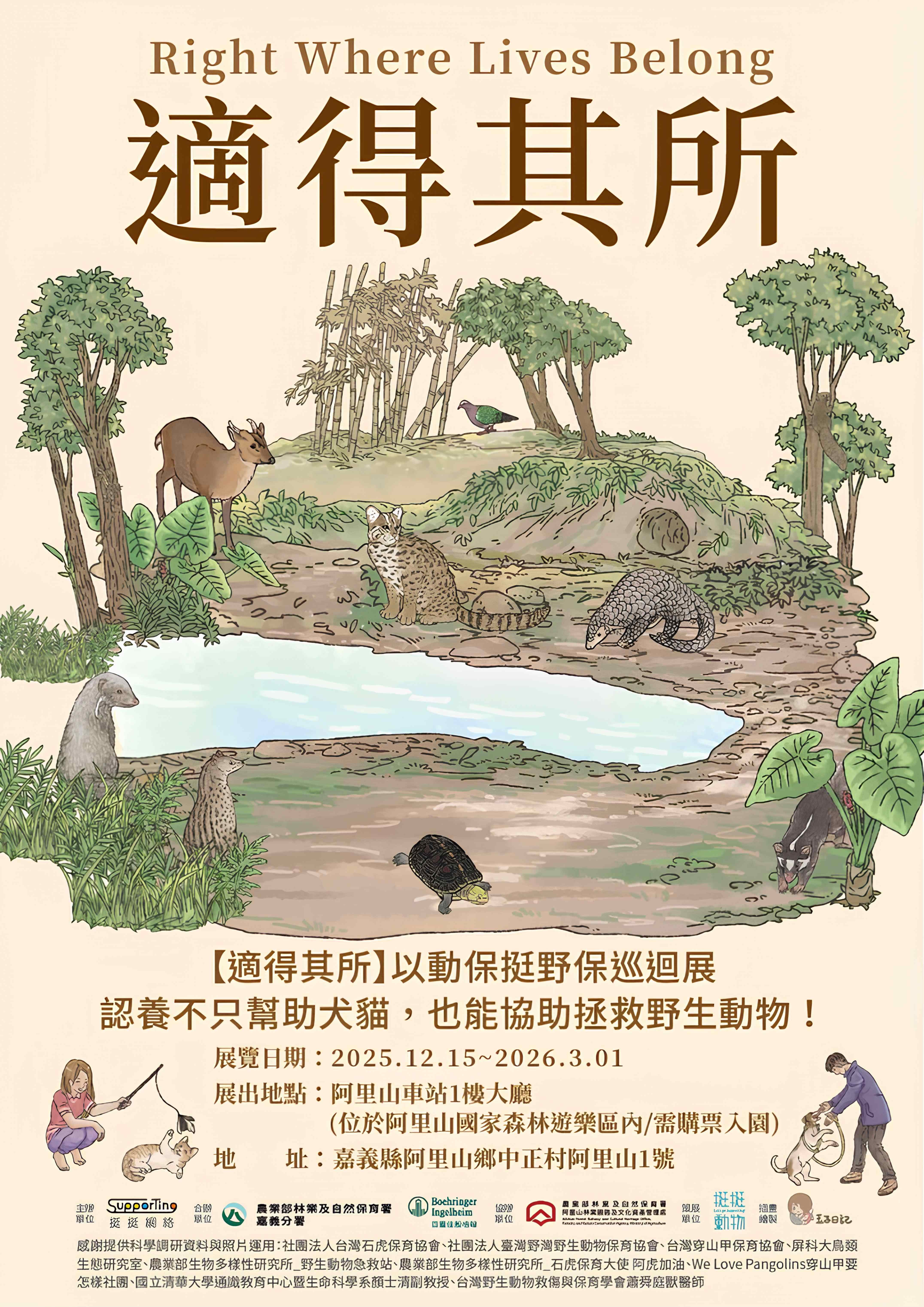 為喚起大眾理解遊蕩犬貓的存在對野生動物生存的威脅,農業部林業及自然保育署嘉義分署及阿里山林業鐵路及文化資產管理處與挺挺網絡社會企業聯名,即日起至115年3月1日於阿里山車站一樓大廳舉辦「適得其所 以動保挺野保巡迴展」活動,展覽以掛軸呈現犬貓馴化歷史與流浪現況,搭配主題影片,揭露野生動物受遊蕩犬貓所面臨的生存壓力,現場亦設置互動牆,加深民眾對原生種與外來種的認識。