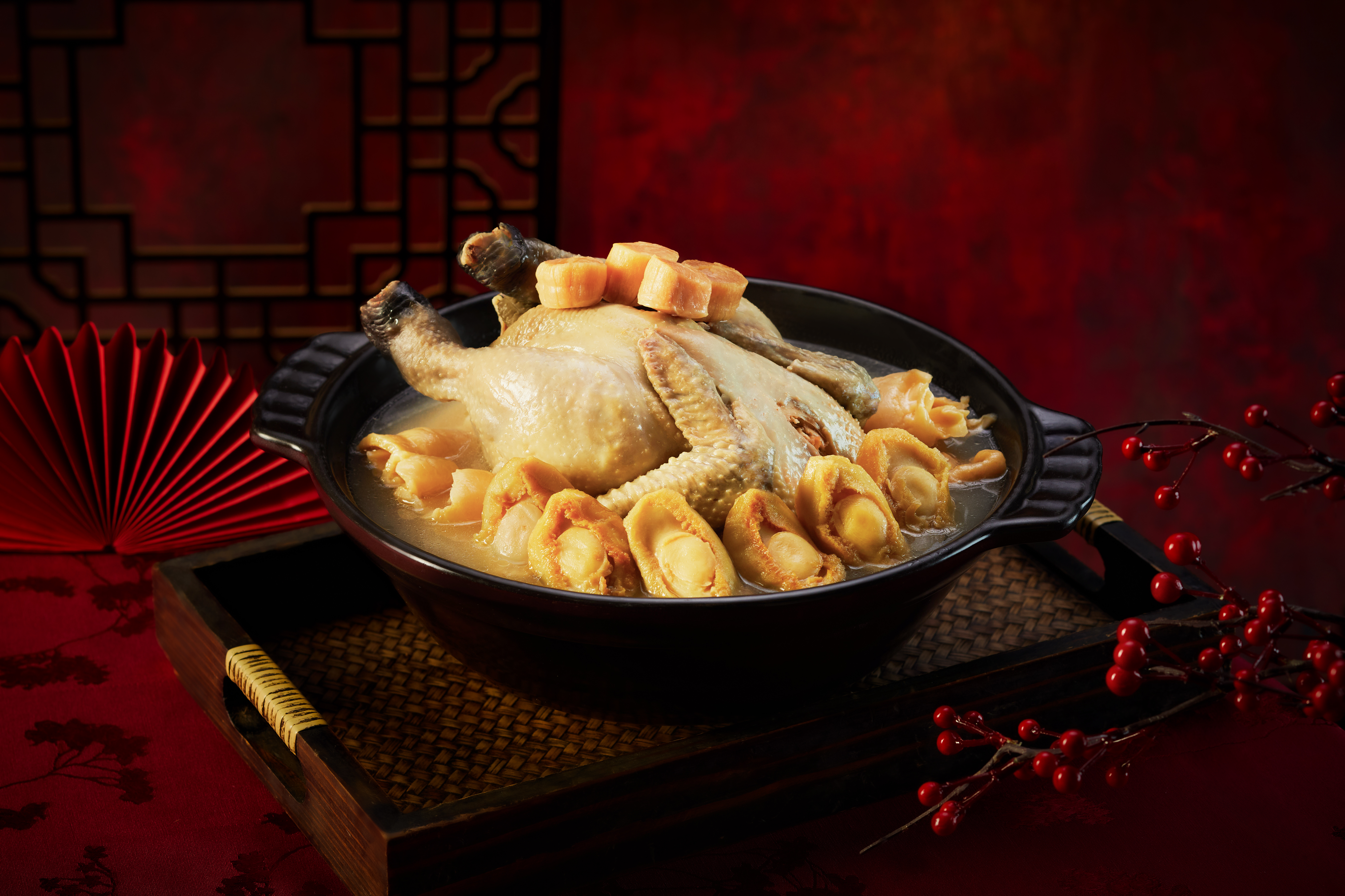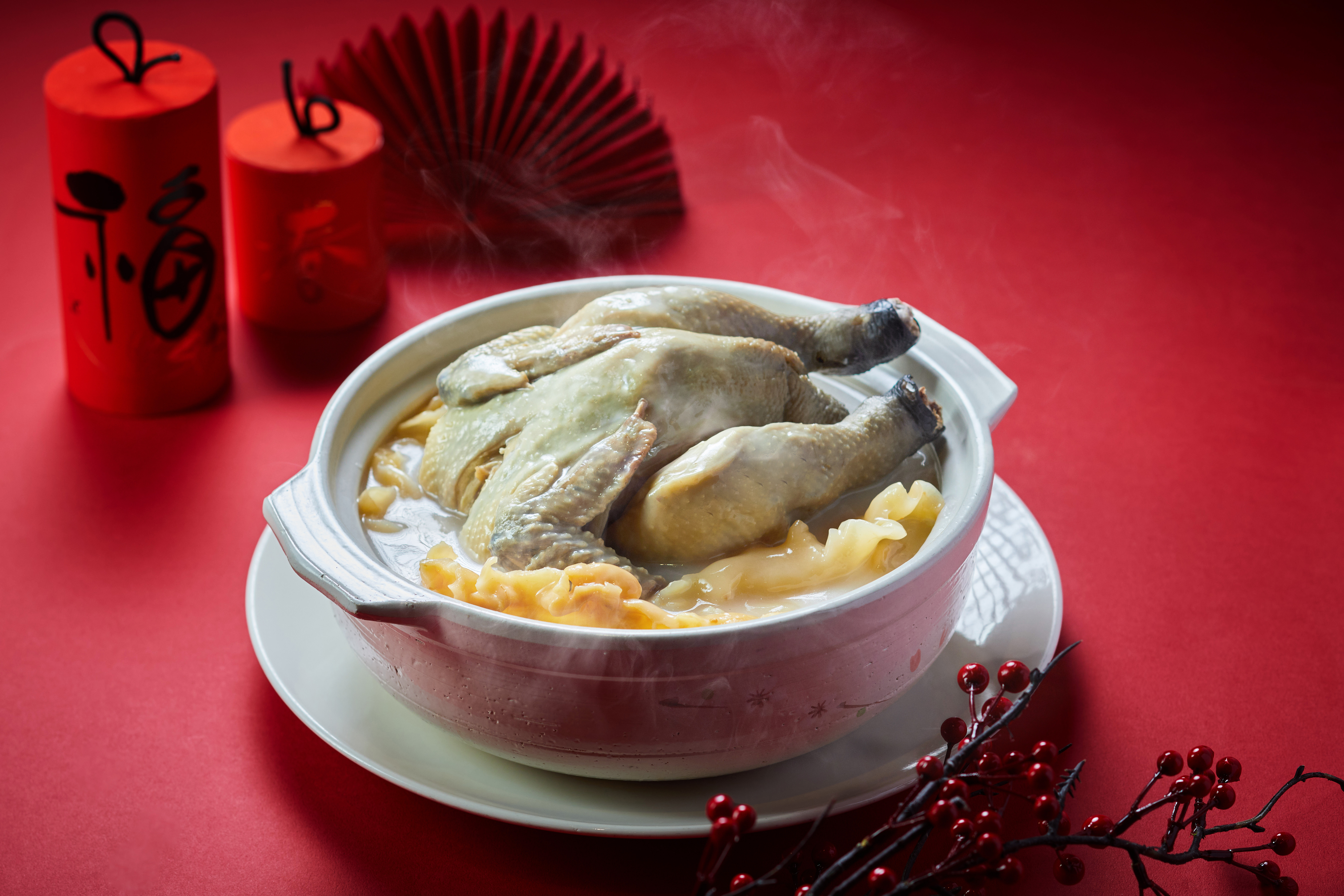 獲得法國美食協會專業行政主廚獎章肯定的高雄圓山大飯店新任主廚劉政良,以老母雞與金華火腿熬煮六小時的上湯為基底,重新詮釋工序繁複的「瑤柱花膠燉鮑魚雞湯」,精選正土雞、花膠、瑤柱與鮑魚等上乘食材入盅,讓膠質與湯頭充分交織,濃而不膩,鮮而不重,每份售價5,088元,啜飲一口湯,為春節團圓飯桌增添原始鮮甜的好滋味。