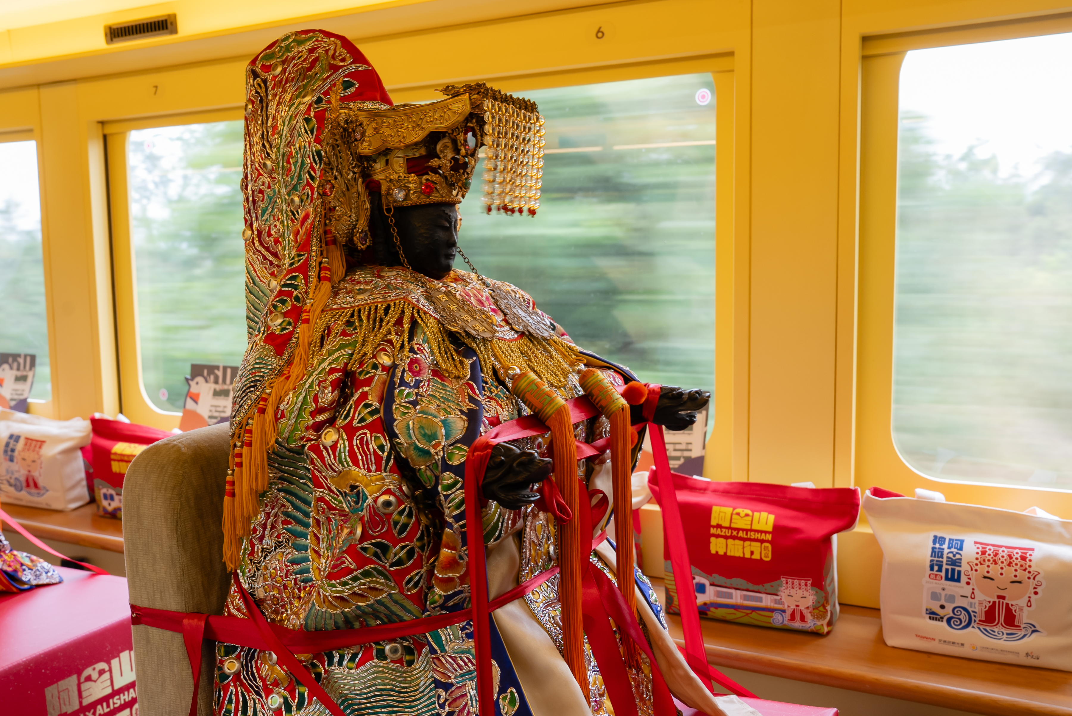 由新港奉天宮四街祖媽、澎湖天后宮、金門南門境天后宮及馬祖天后宮等四大尊神領銜首度搭乘林鐵「栩悅號」生態列車 圖/阿里山管理處提供