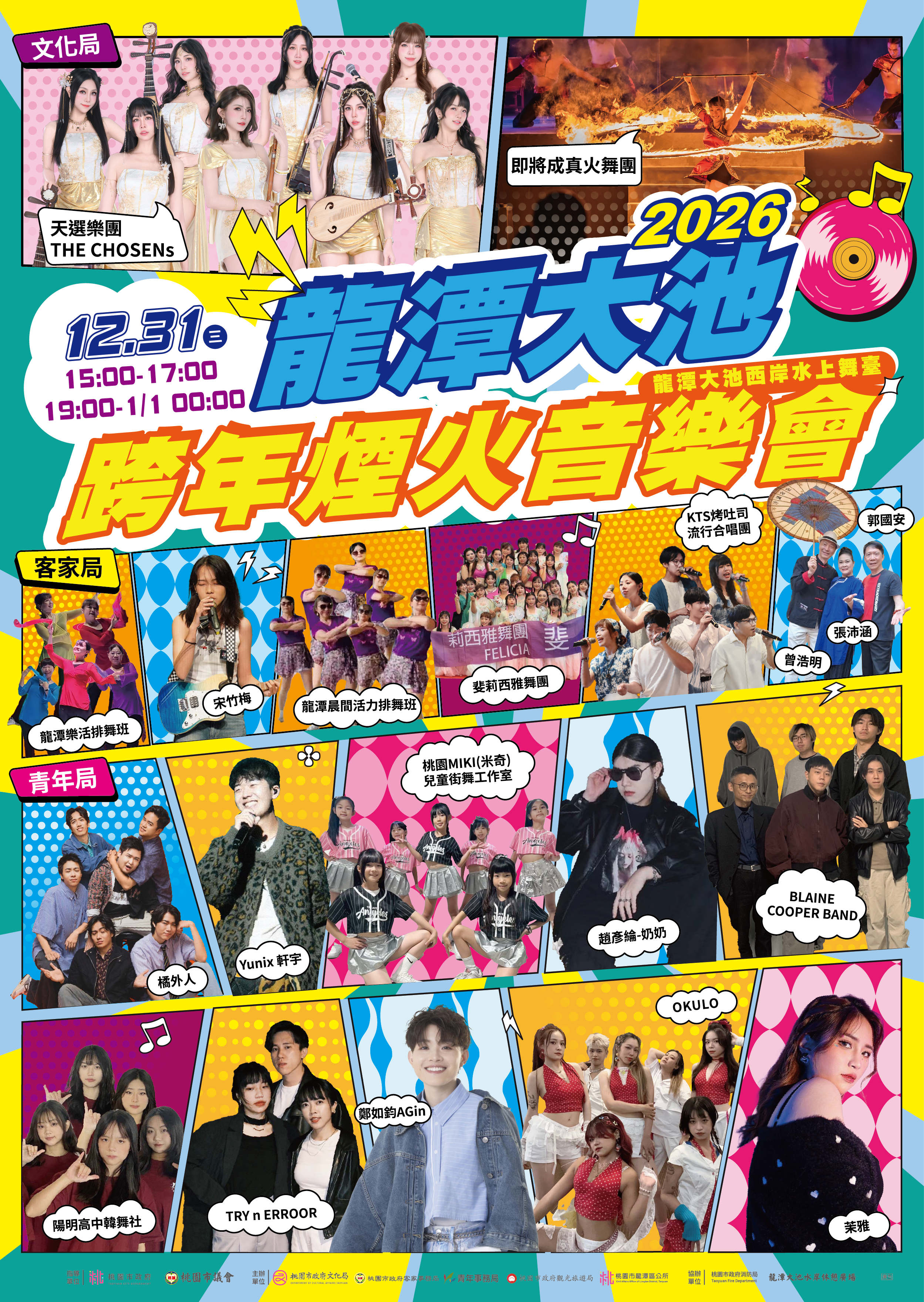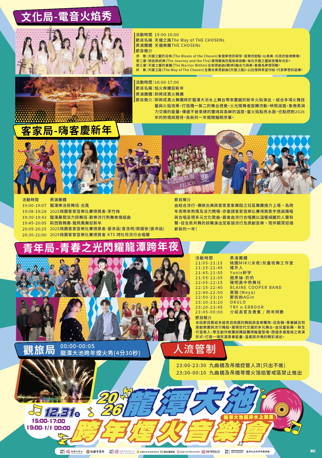 晚間7時則由客家局「嗨客慶新年」登場,由結合流行、傳統古典與客家意象之在地龍潭樂活排舞班、龍潭晨間活力排舞班與莉西雅舞團開場,後續邀請客家音樂比賽得獎歌手宋竹梅、張沛涵、曾浩明及郭國安,透過獨唱與合唱呈現多元文化歌曲,本段節目尾聲由KTS 烤吐司流行合唱團,帶來三首原創客語作品,以流行音樂與阿卡貝拉詮釋客家音樂,呈現客家歌曲不同樣貌;青年局將於晚間9時推出壓軸節目「青春之光閃耀龍潭跨年夜」,集結多組來自桃園的舞蹈與音樂團隊,從街舞、青春饒舌到原創樂團與流行舞蹈,展現世代交織的多元舞台,由兒童街舞、新生代音樂人、學生創作樂團與舞蹈團隊輪番登場,透過多樣風格之表演形式,以年輕的活力與熱情,陪伴現場民眾一起倒數,在璀璨的煙火中迎接新的開始。