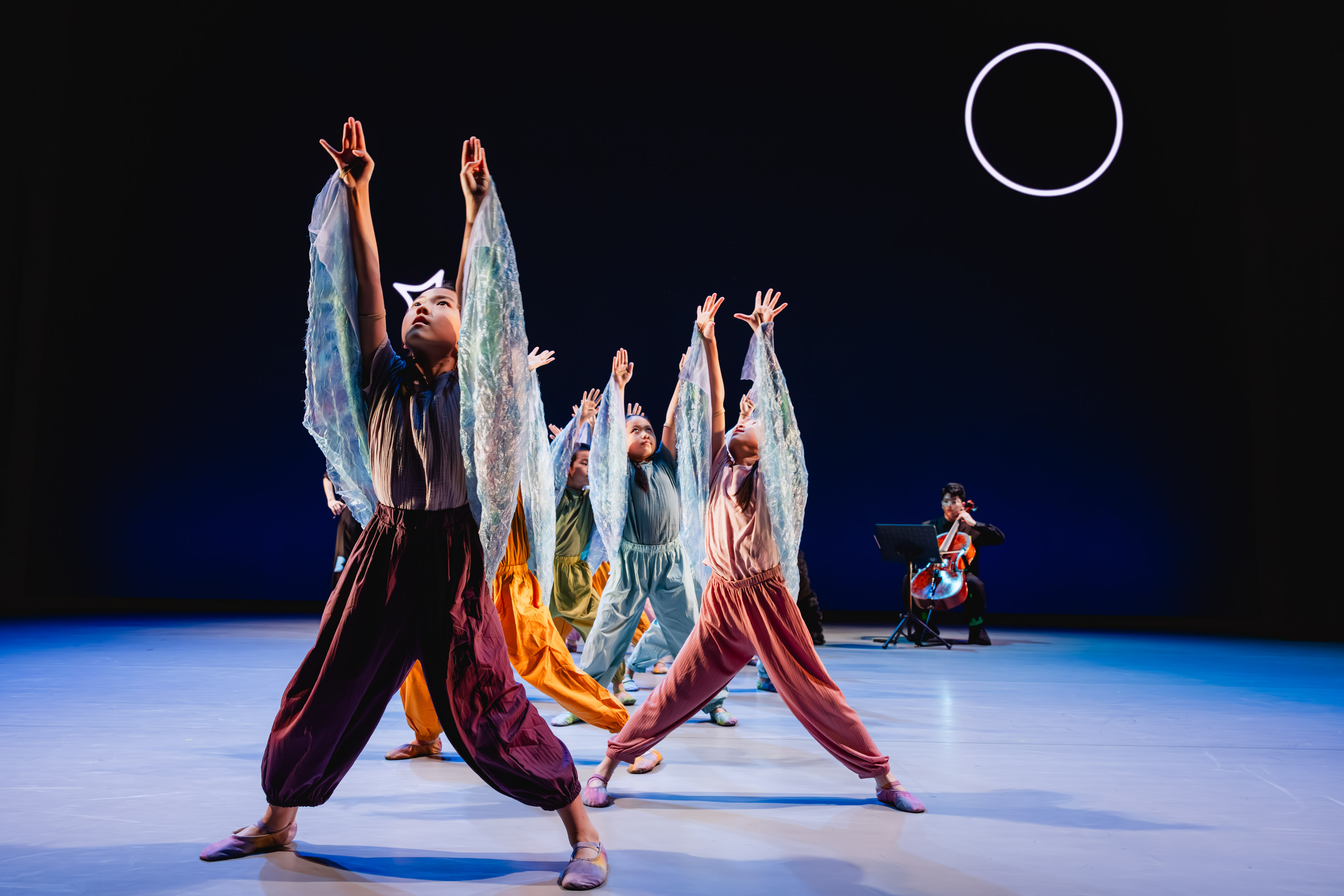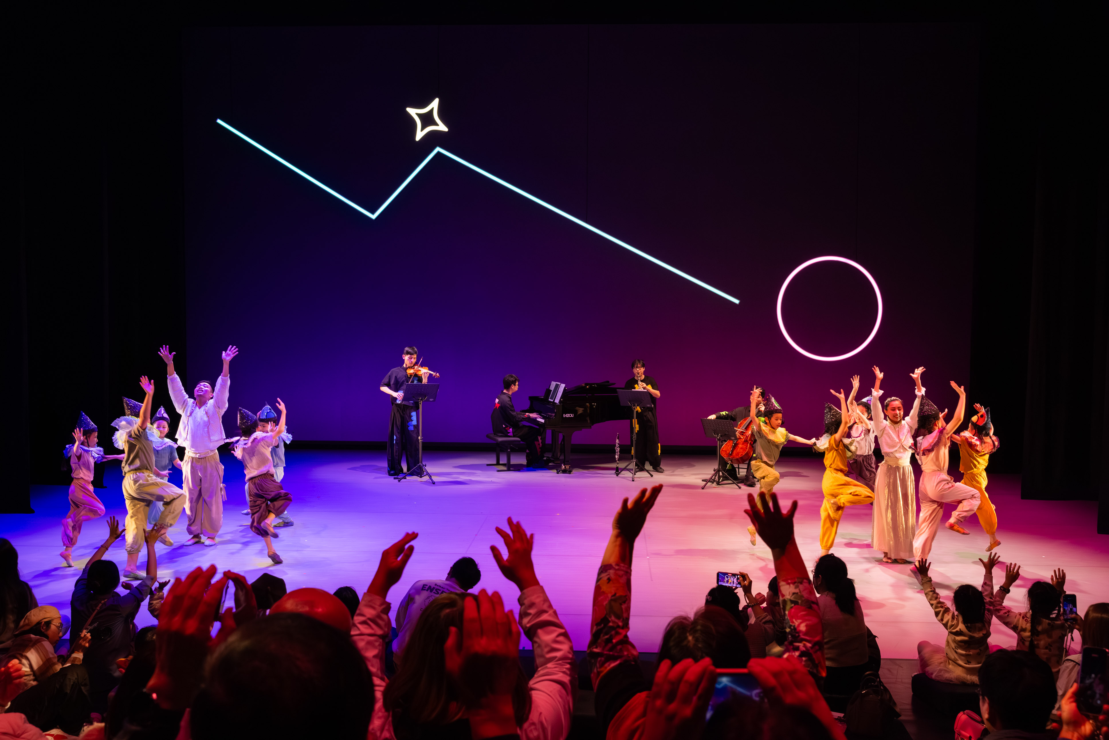 舞台上,弦樂四重奏現場演奏《天方夜譚》,從細膩的弦音到富戲劇性的節奏,共同營造濃厚的異國氛圍。小舞者的參與,則以舞蹈的身體讓故事畫面立體,讓每一場演出都成為獨一無二的奇幻冒險。