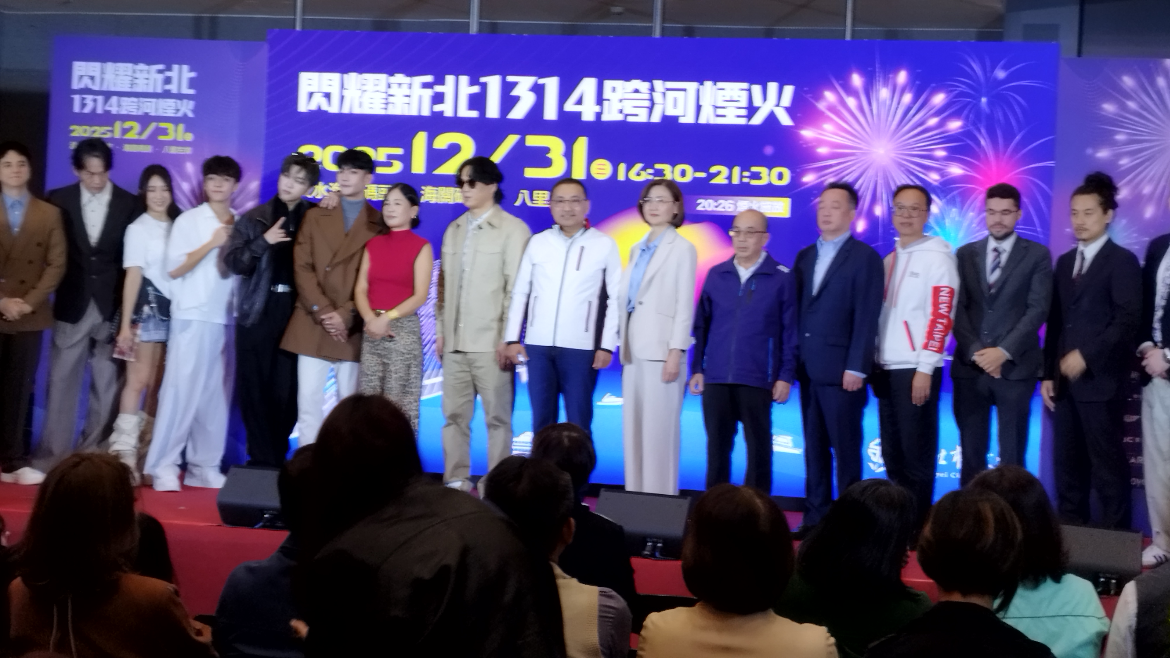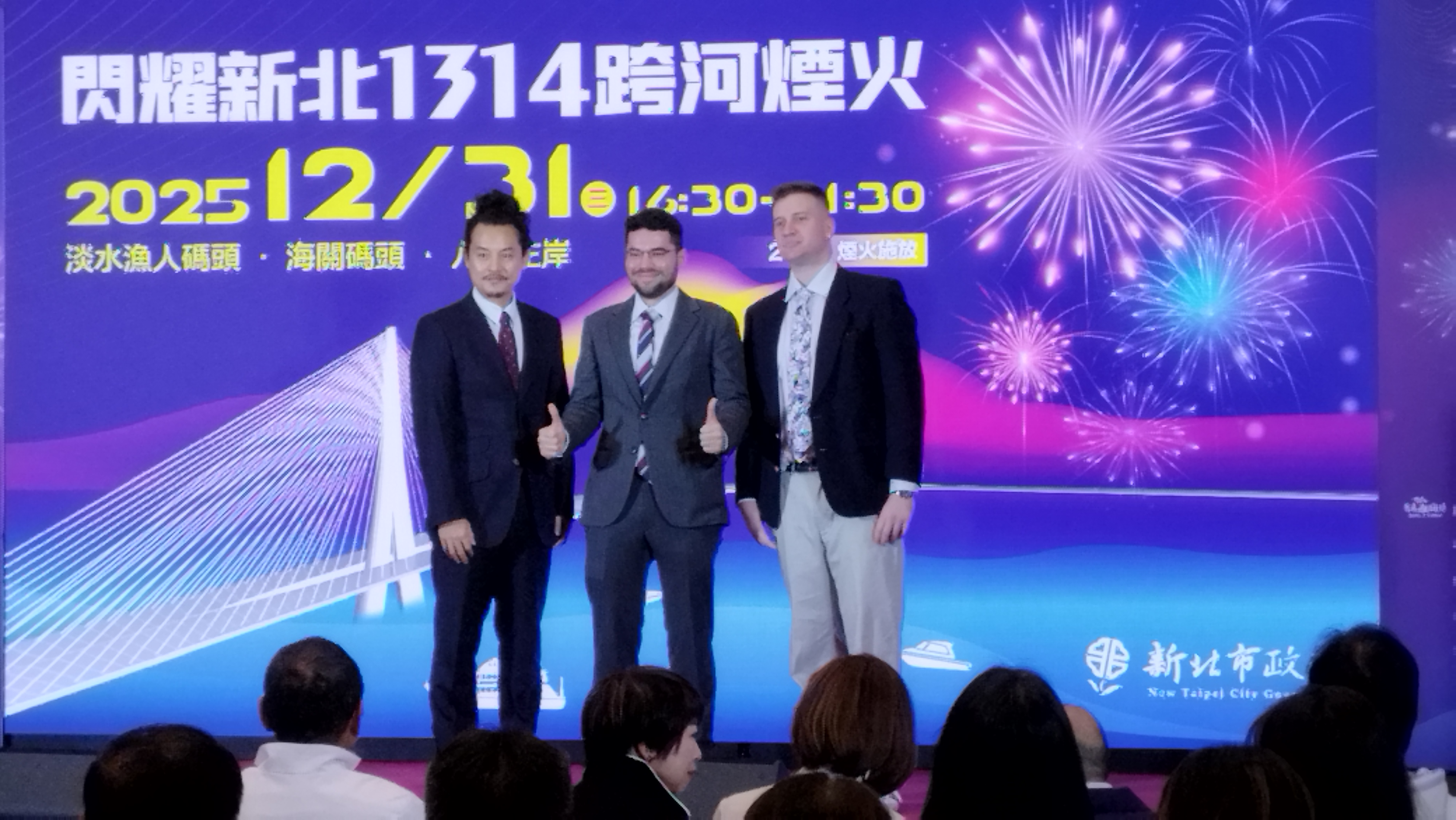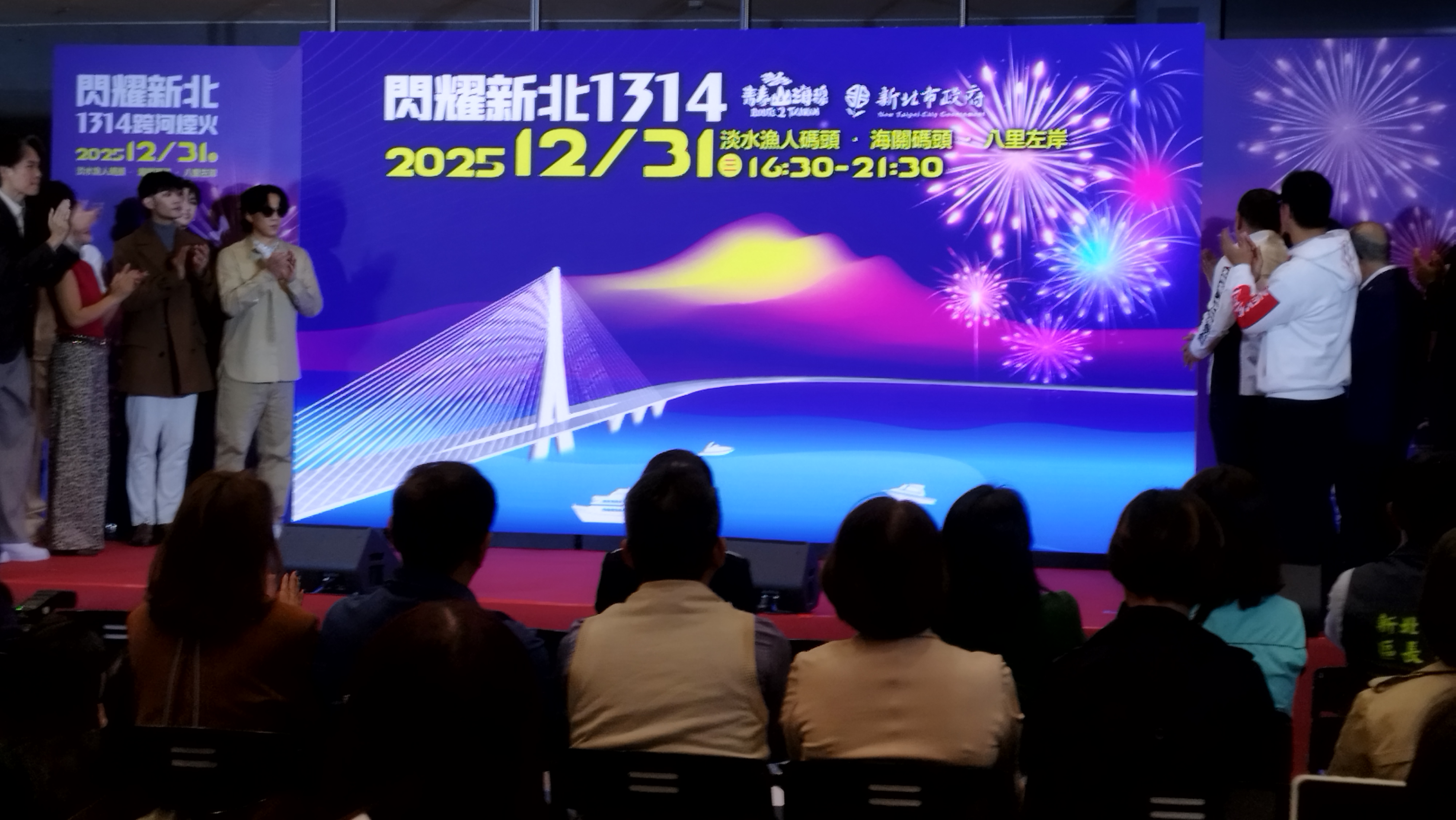 新北市政府12月8土日舉辦「閃耀新北1314跨河煙火」記者會,新北市長侯友宜出席與現場嘉賓一起參與啟動儀式。侯友宜表示,今年跨河煙火自20時26分開始施放,象徵2026年的到來,施放時長達13分14秒則寓意「一生一世」。