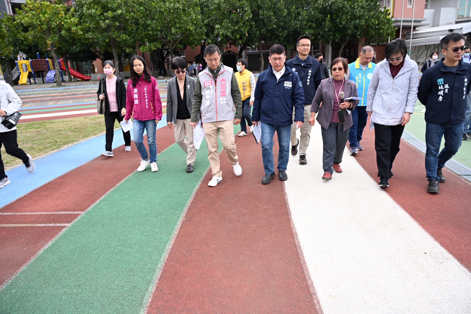本次考察行程依序前往竹北新社國小、博愛國小、中正國小、興隆國小及東興國小,針對校園體育基礎設施改善進行實地檢視與說明。其中,博愛國小要爭取270萬元經費,進行室內活動空間與地板整建;新社國小要爭取560萬元,辦理籃球場整建工程;興隆國小要爭取644萬元,用於操場跑道整建;中正國小籃球場整建經費達596萬元;東興國小則要爭取1,373萬元經費,全面進行操場跑道及足球場整建。相關經費均爭取國教署相關預算,配合地方配合款執行,逐步改善校園運動與學習環境。